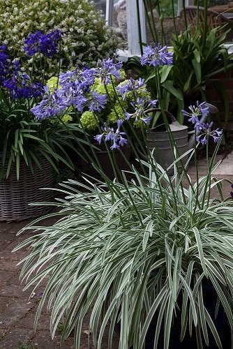 アガパンサスの青い花は夏の庭には欠かせませんが、開花は夏のみなので、他の季節も楽しめる斑入りタイプは庭にぜひ欲しいものです。
