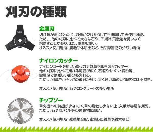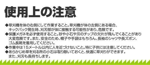 | 石、障害物の飛散が少なく安全な肩掛け式のエンジン刈払機(草刈機)です。柔らかい草や金属刃では刈る事ができない所(フェンス等)で刈る「ナイロンカッター」が付属しています。 |