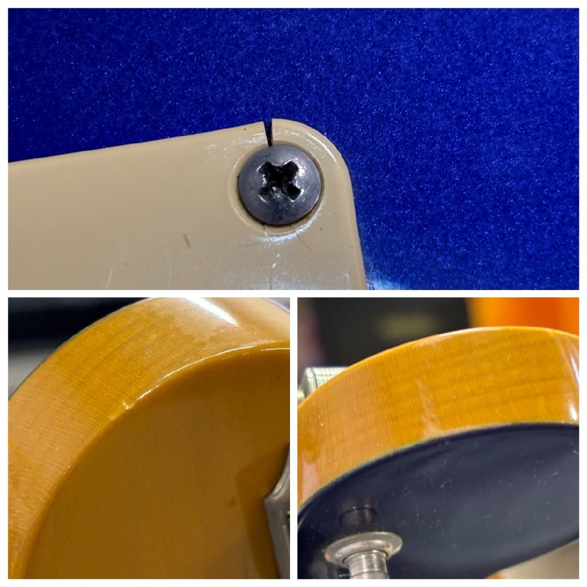 | ◆外観◆ ・★キズ、汚れ、使用感があります。 ・★ボディ:傷・汚れ・スレ・バックパネルに割れ・ネック根本付近に塗装割れがあります。 ・★ネック:傷・汚れ・スレがあります。 ・★ヘッド:傷・スレ・打痕があります。 ・★金具:くすみがあります。 ・★ブリッジ、ペグ、ナットが交換されているものと思われます。 |