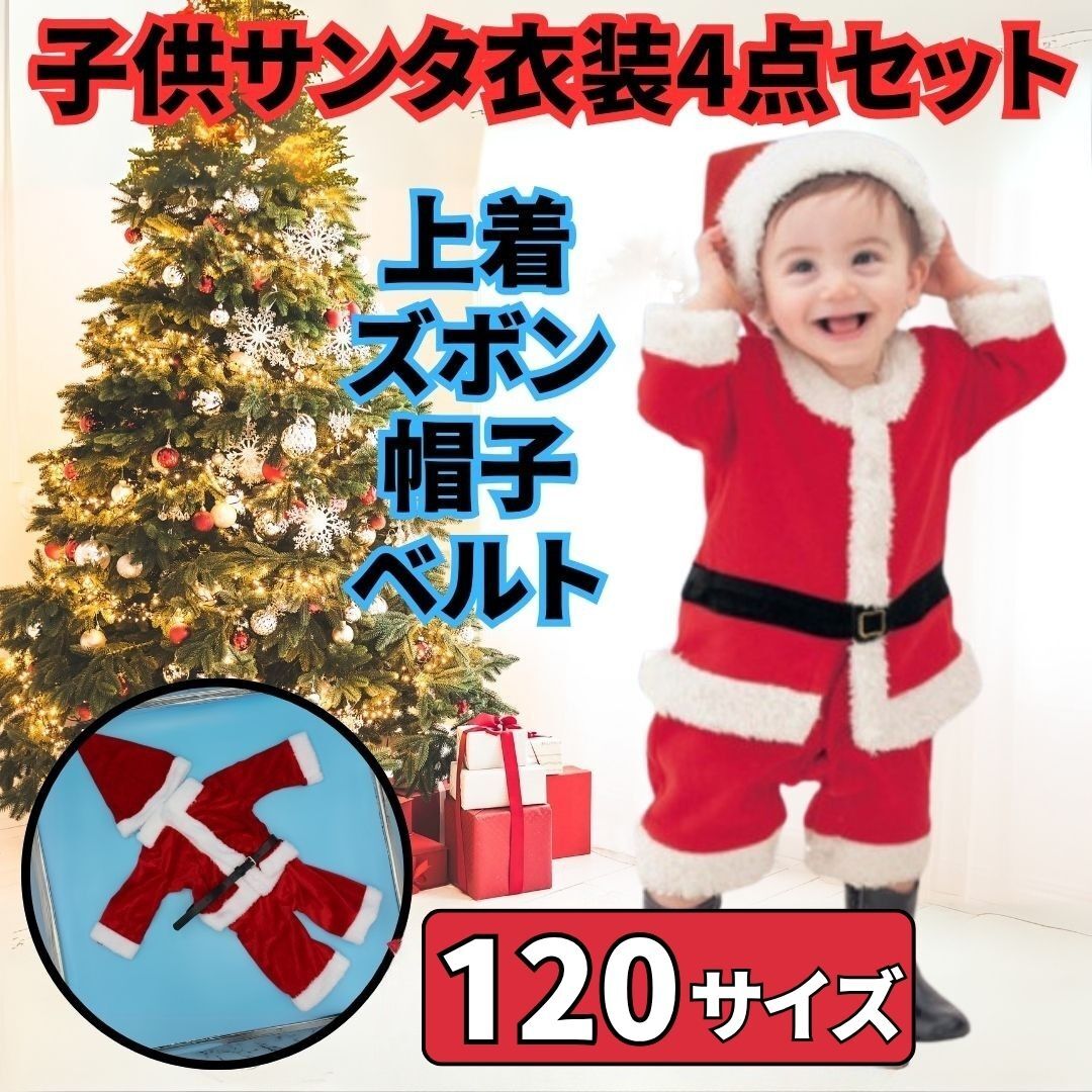 サンタクロース 衣装4点 120サイズ 子供用男の子 クリスマス スーツ サンタ コスプレセット コスチューム 着ぐるみ 帽子 ベルト 上着ズボン