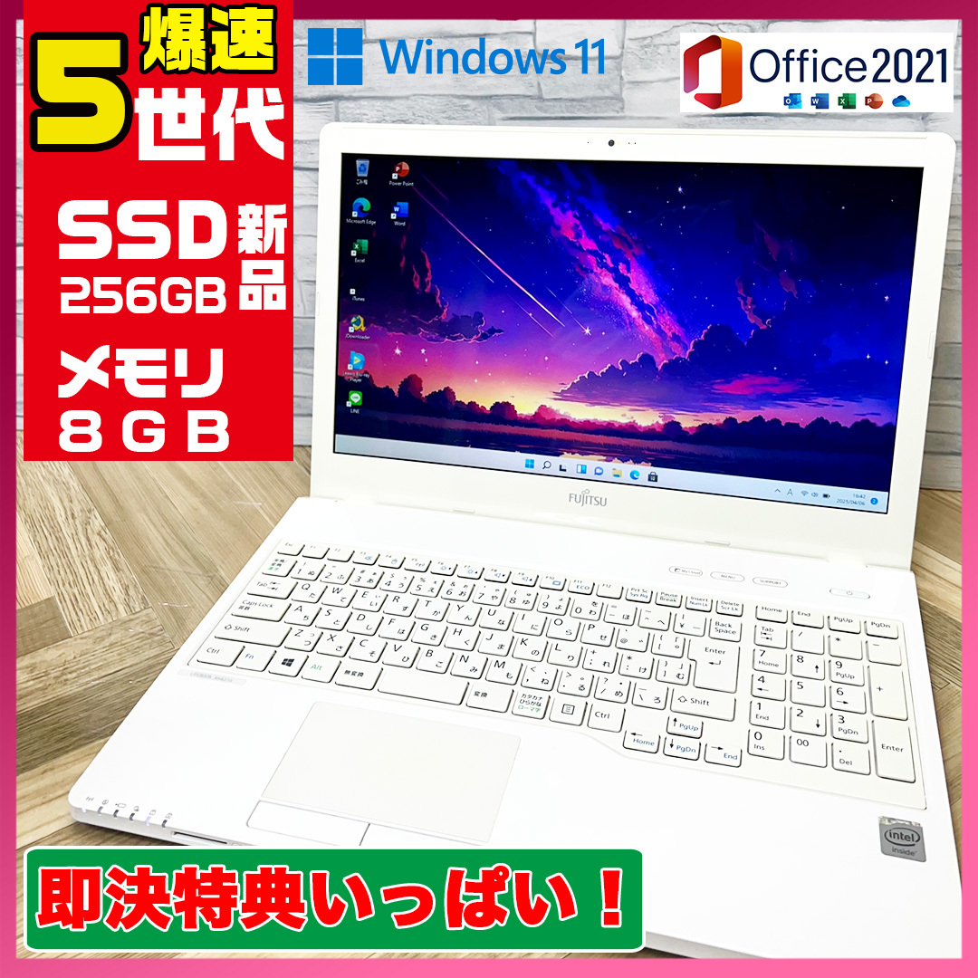 極上品/新型Window11搭載/富士通/爆速5世代CPU/カメラ/高速新品SSD256GB/驚異の8GBメモリ/DVD焼き/オフィス/ソフト多数!
