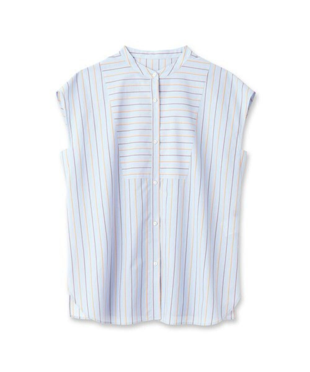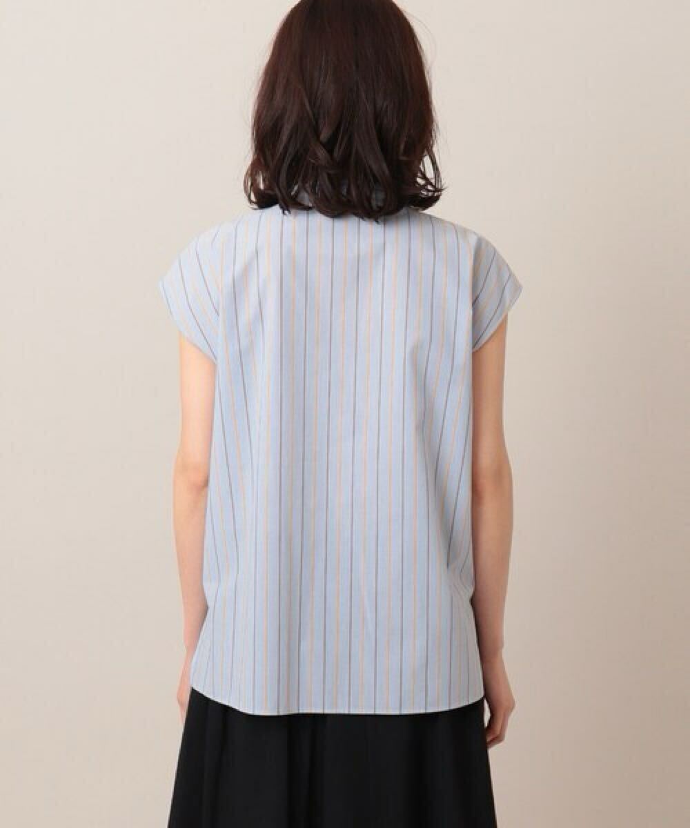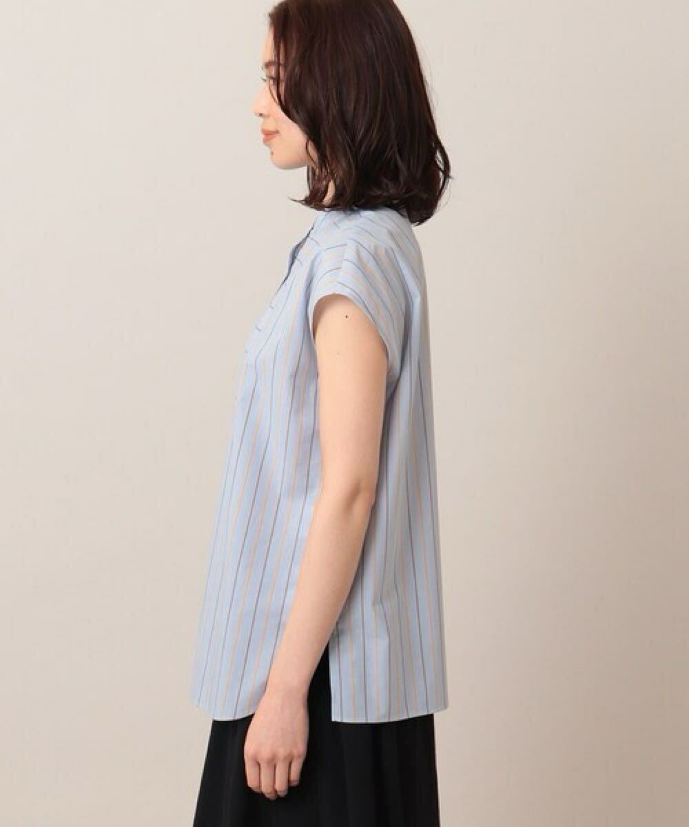 二の腕をカバーし、少し肩にかかる袖丈がPOINT!インナーが見えないように袖底にマチを作っています。裾は前だけハーフインしやすいテールカーブ&サイドスリットもPOINT!タテ、ヨコ50/1の混紡糸を使用したボイルのストライプ素材。肌離れが良くサラリとした風合いが特徴で非常に清涼感があります。特殊加工により滑らかな表面感に仕上げ、T/Cによる適度なハリ感も兼ね備えた先染めのストライプ素材となっております。パンツとスッキリ合わせても、ボリュームスカートにインしても決まります!
