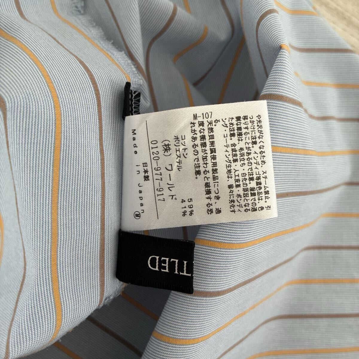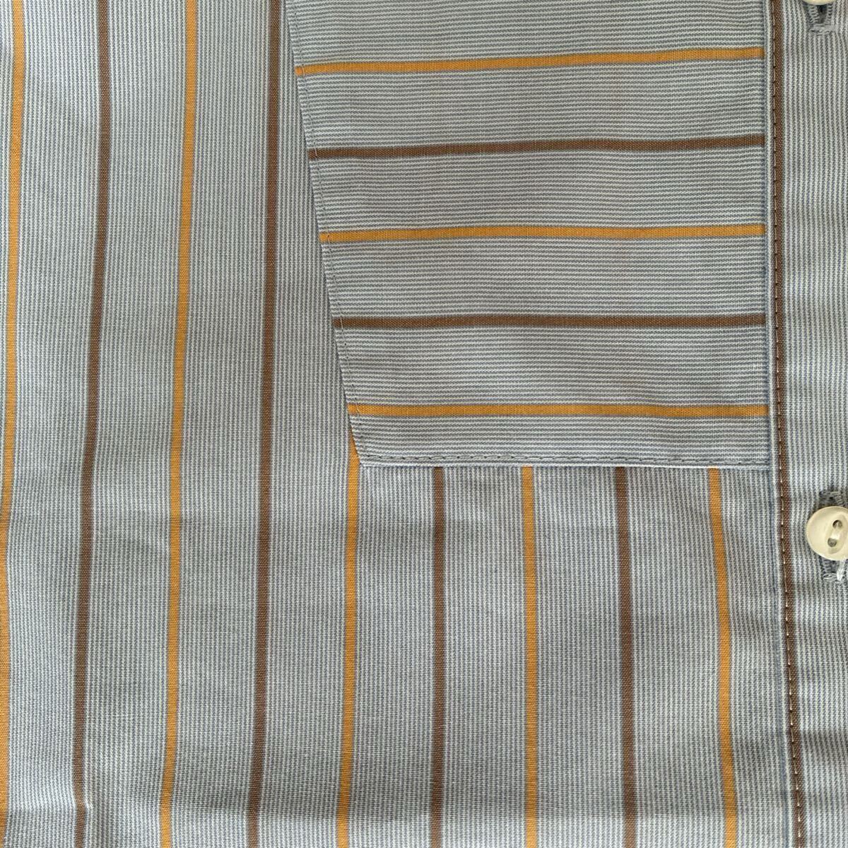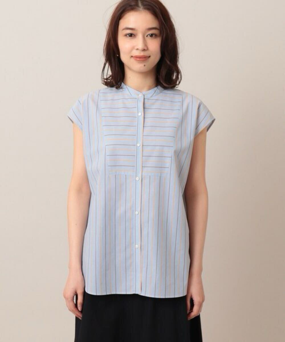 二の腕をカバーし、少し肩にかかる袖丈がPOINT!インナーが見えないように袖底にマチを作っています。裾は前だけハーフインしやすいテールカーブ&サイドスリットもPOINT!タテ、ヨコ50/1の混紡糸を使用したボイルのストライプ素材。肌離れが良くサラリとした風合いが特徴で非常に清涼感があります。特殊加工により滑らかな表面感に仕上げ、T/Cによる適度なハリ感も兼ね備えた先染めのストライプ素材となっております。パンツとスッキリ合わせても、ボリュームスカートにインしても決まります!