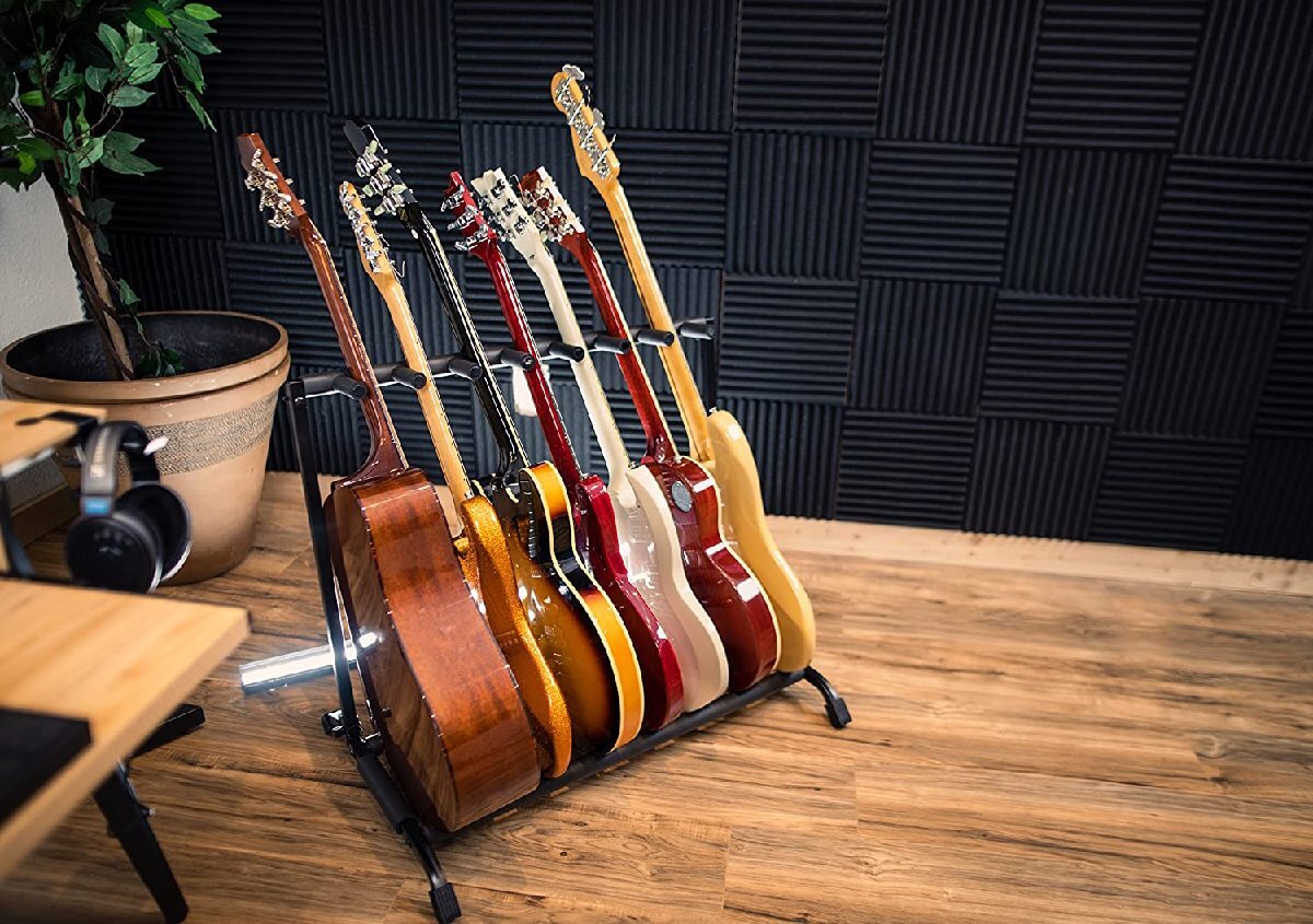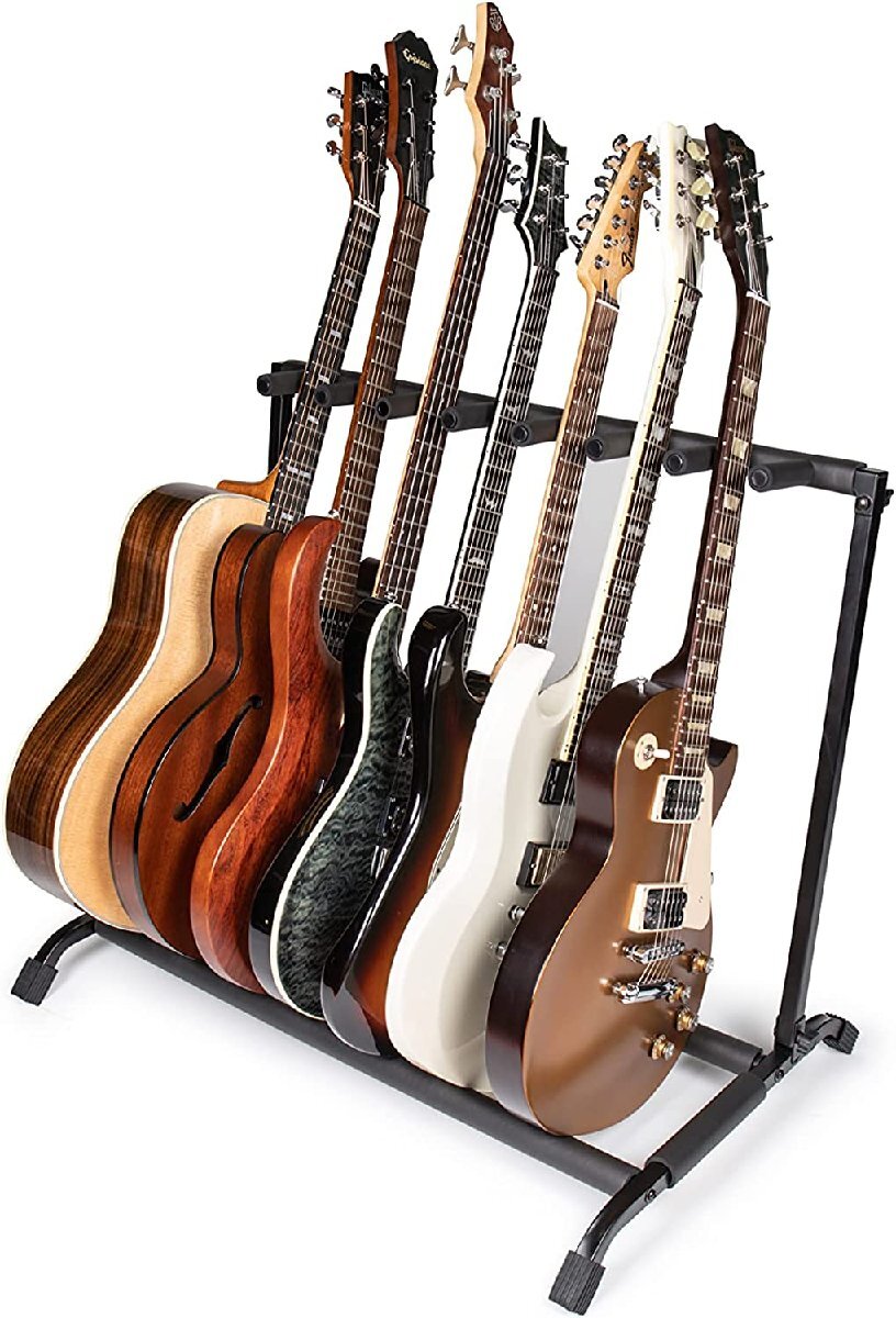 エレキギターやアコースティックギターを最大7本セット可能 / ブラックパウダーコート仕上げ / 丈夫なスチール製フレーム / 折り畳んで収納可能