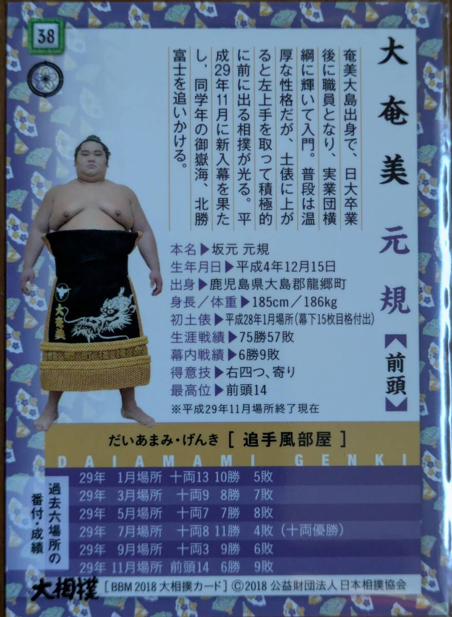 前頭 大奄美関(追手風部屋)のレギュラーカードです。