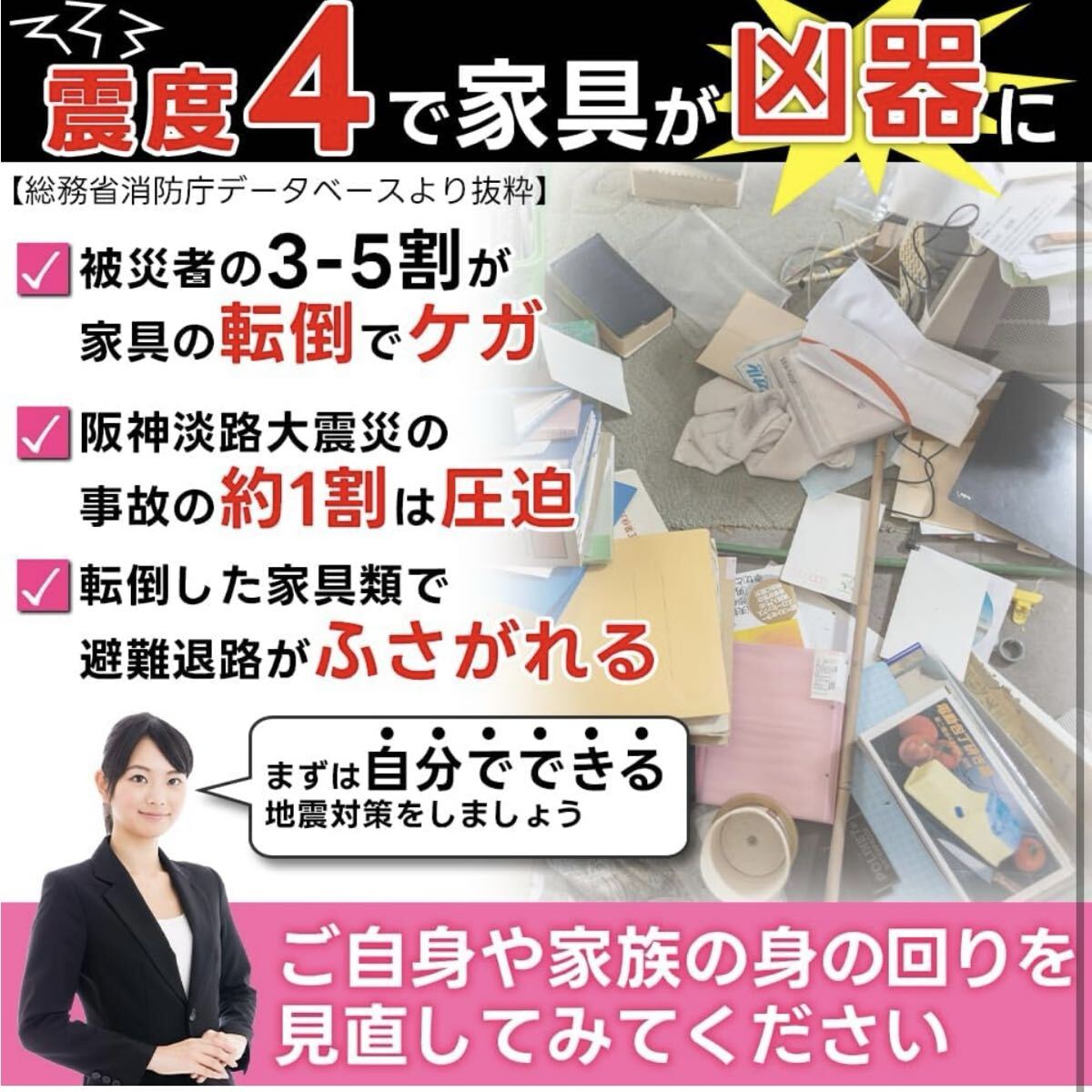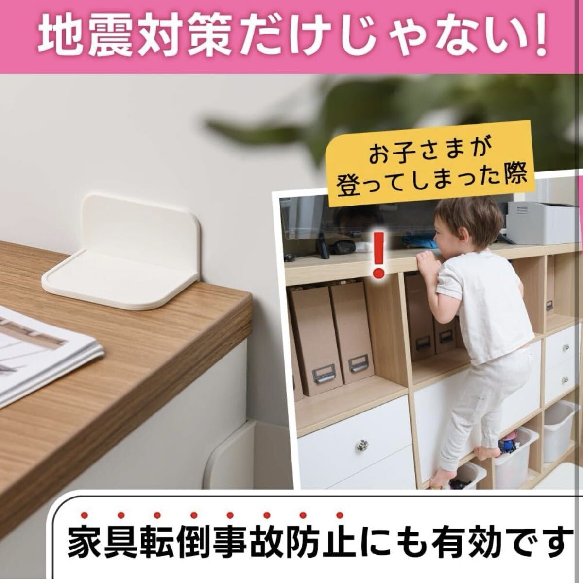 大きな地震に備えて食器棚や本棚などの家具を倒れないようガッチリ固定するストッパーです。本体は薄型で余計な装飾が無いシンプルなデザインにより、周囲の環境に溶け込み目立ちません。