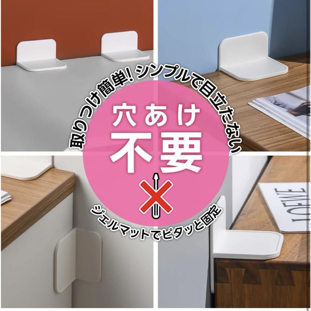 使い方は本体の背面と家具に接触する面にジェルマットを貼り付けてから、家具と壁の間に挟むだけ!穴開け工事や工具が必要ないため、賃貸住宅にお住いの方にもお勧めのアイテムです。