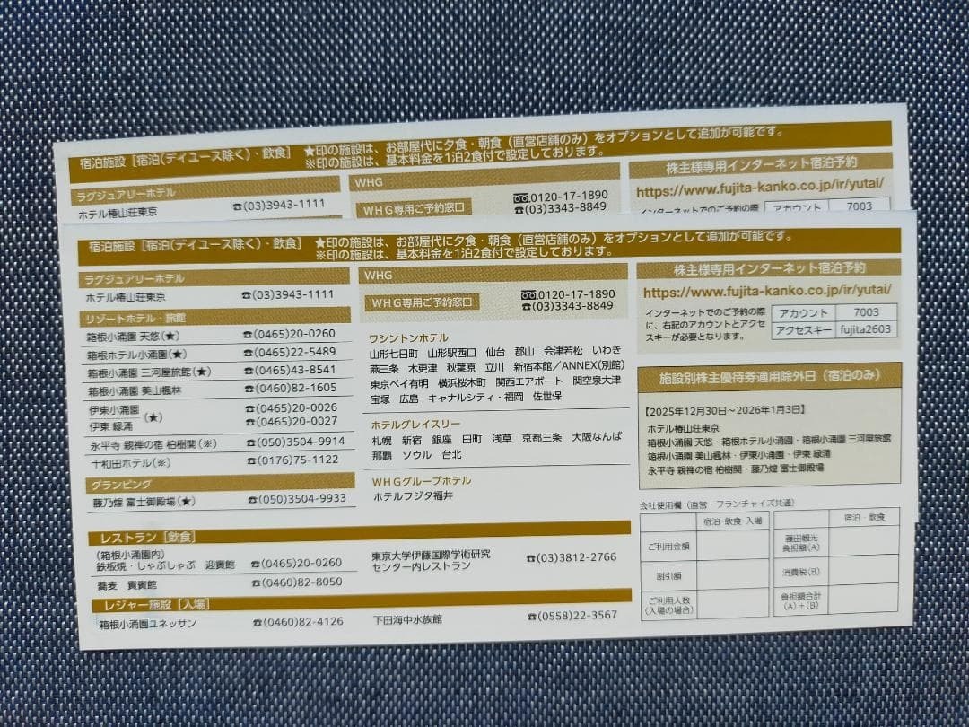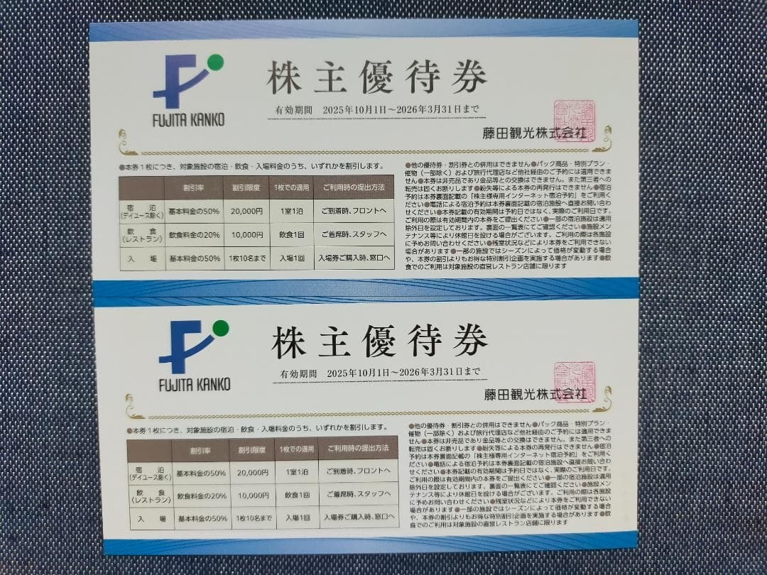 藤田観光株主優待券宿泊、施設入場50%割引券2枚です。