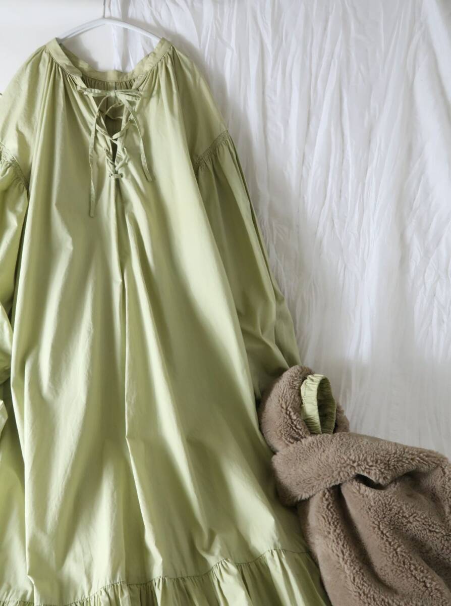 少しハリ感のあるコットン生地と、ボリューム感が可愛い1枚。 首元のレースアップがすっきりみせてくれるポイントです。