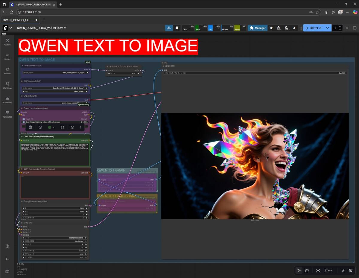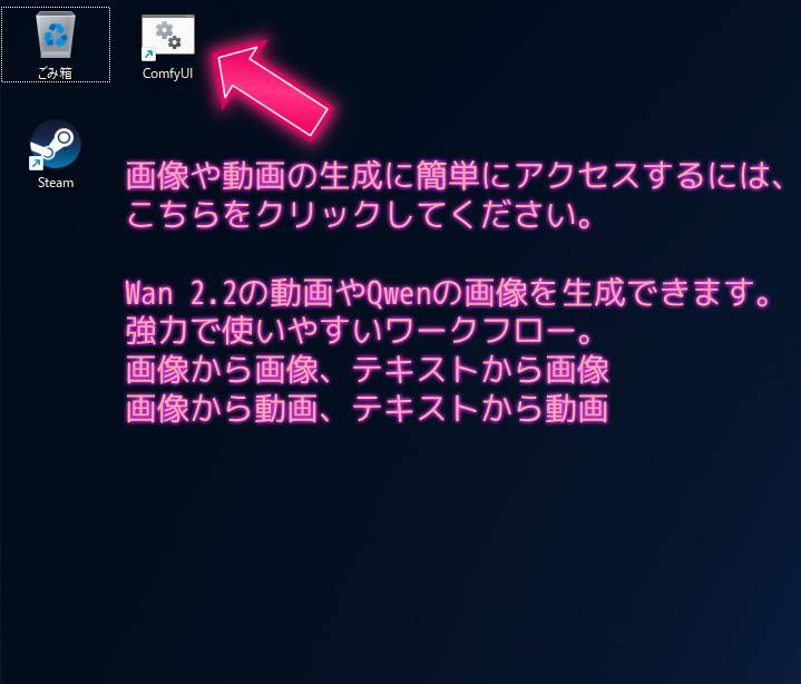 ComfyUIを使用して、Wan 2.2による動画生成、QwenおよびQwen 2509による画像生成・編集ができるように設定済みです。