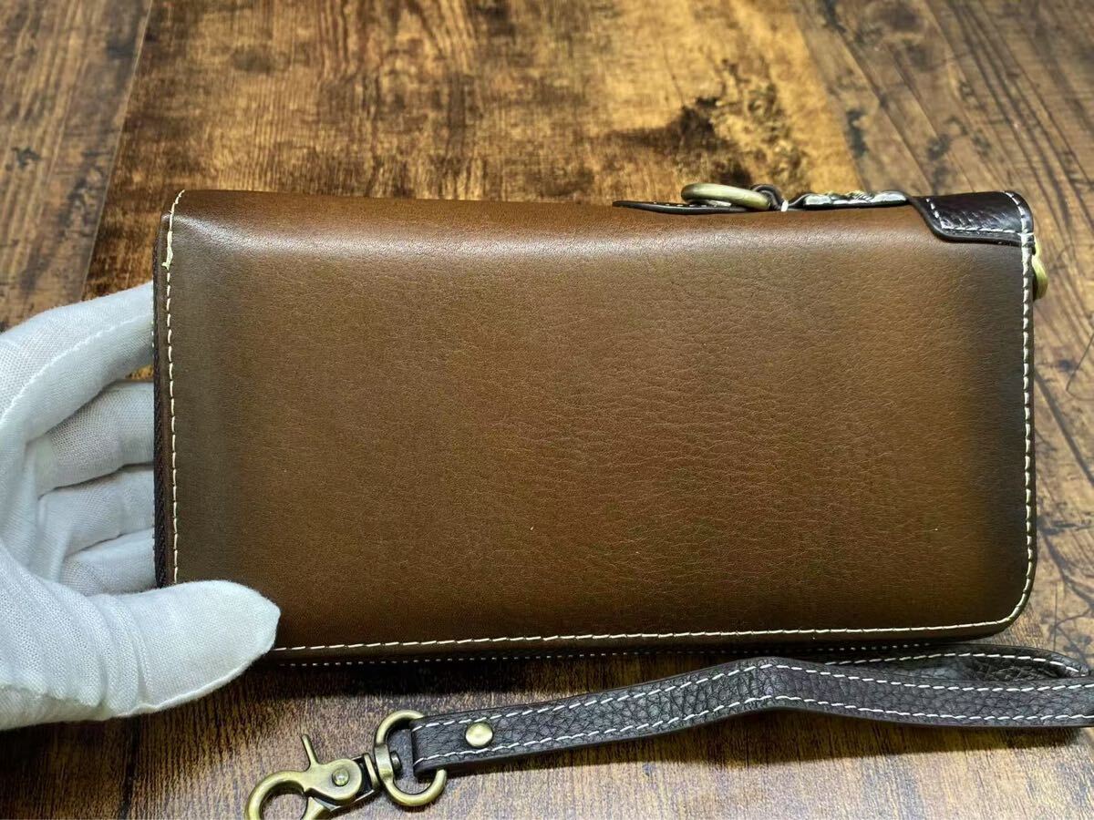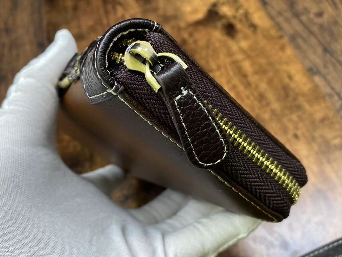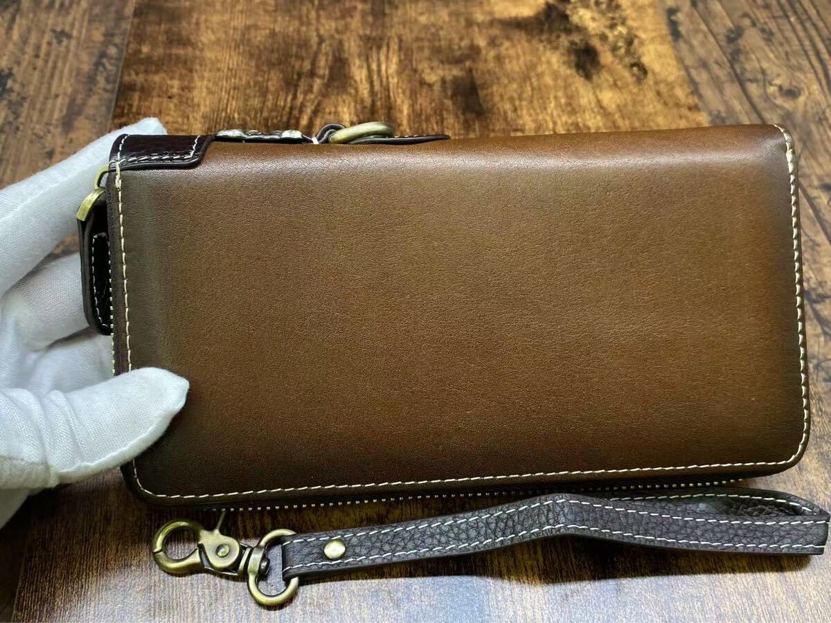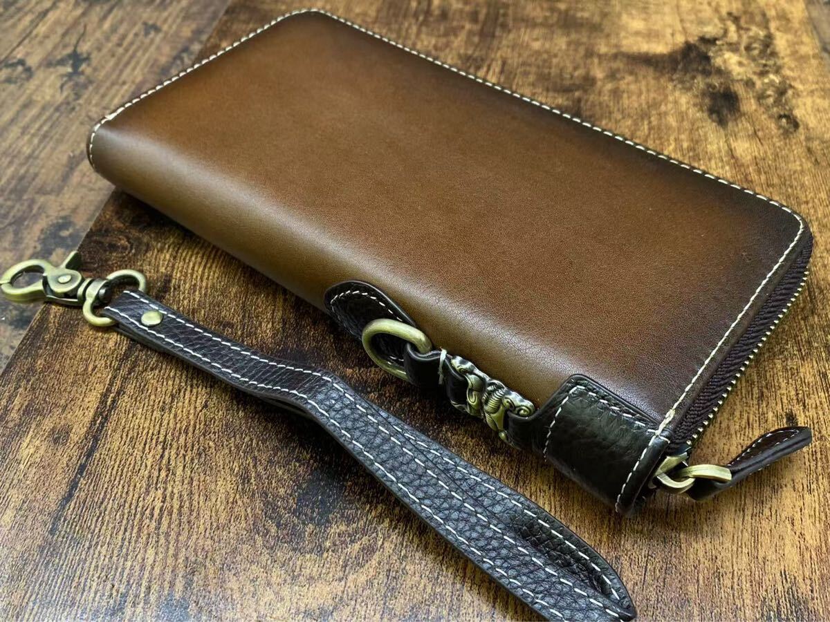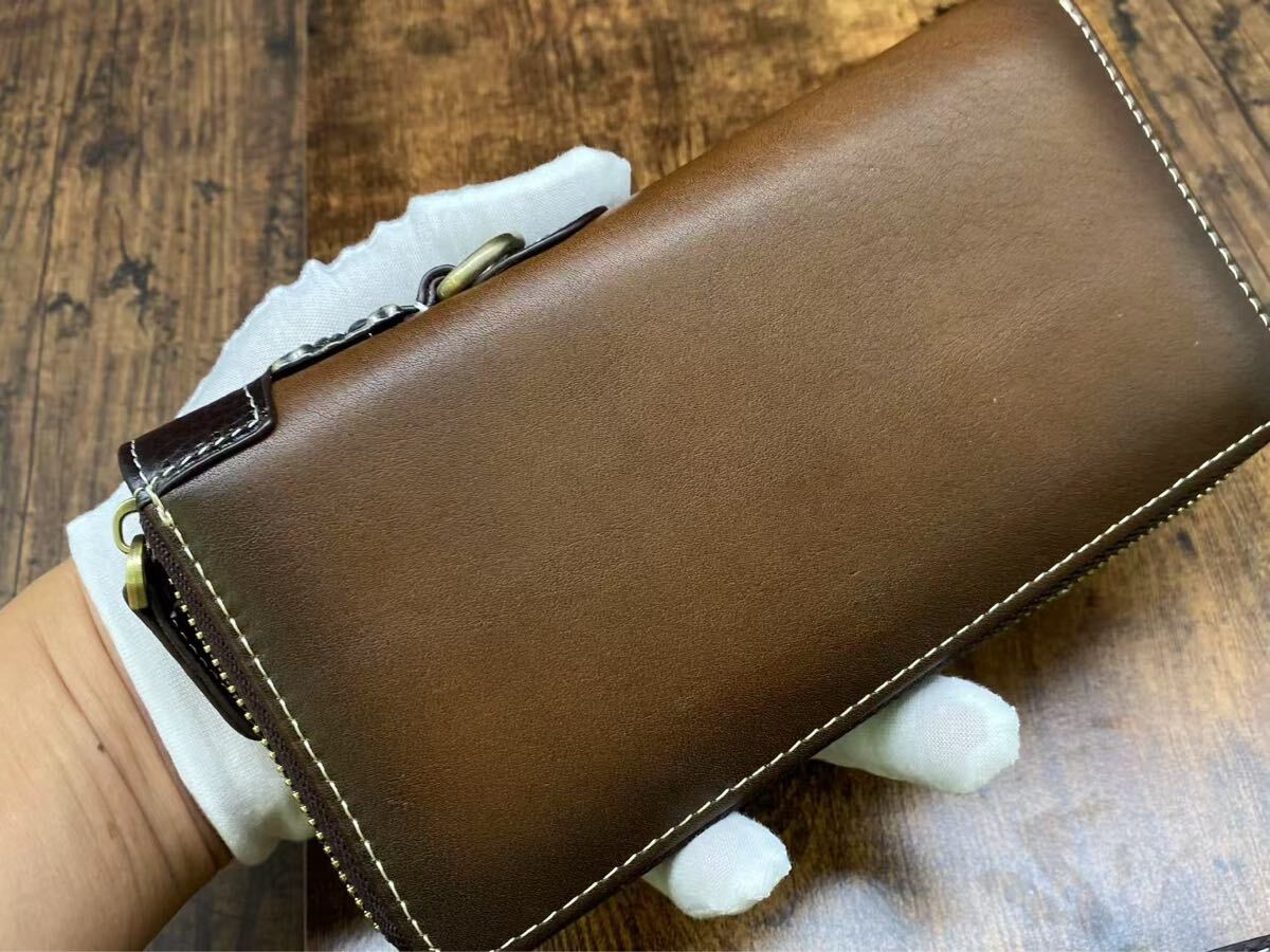 こちらは 新品・未使用の本革長財布 です。上質な牛革を使用し、職人による丁寧な仕上げで、高級感と耐久性を兼ね備えています。ラウンドファスナー仕様で開閉がスムーズ、カードや紙幣、小銭をしっかり収納可能。取り外し可能なハンドストラップ付きで、持ち運びも便利です。メンズ・レディース問わずお使いいただけるデザインです。