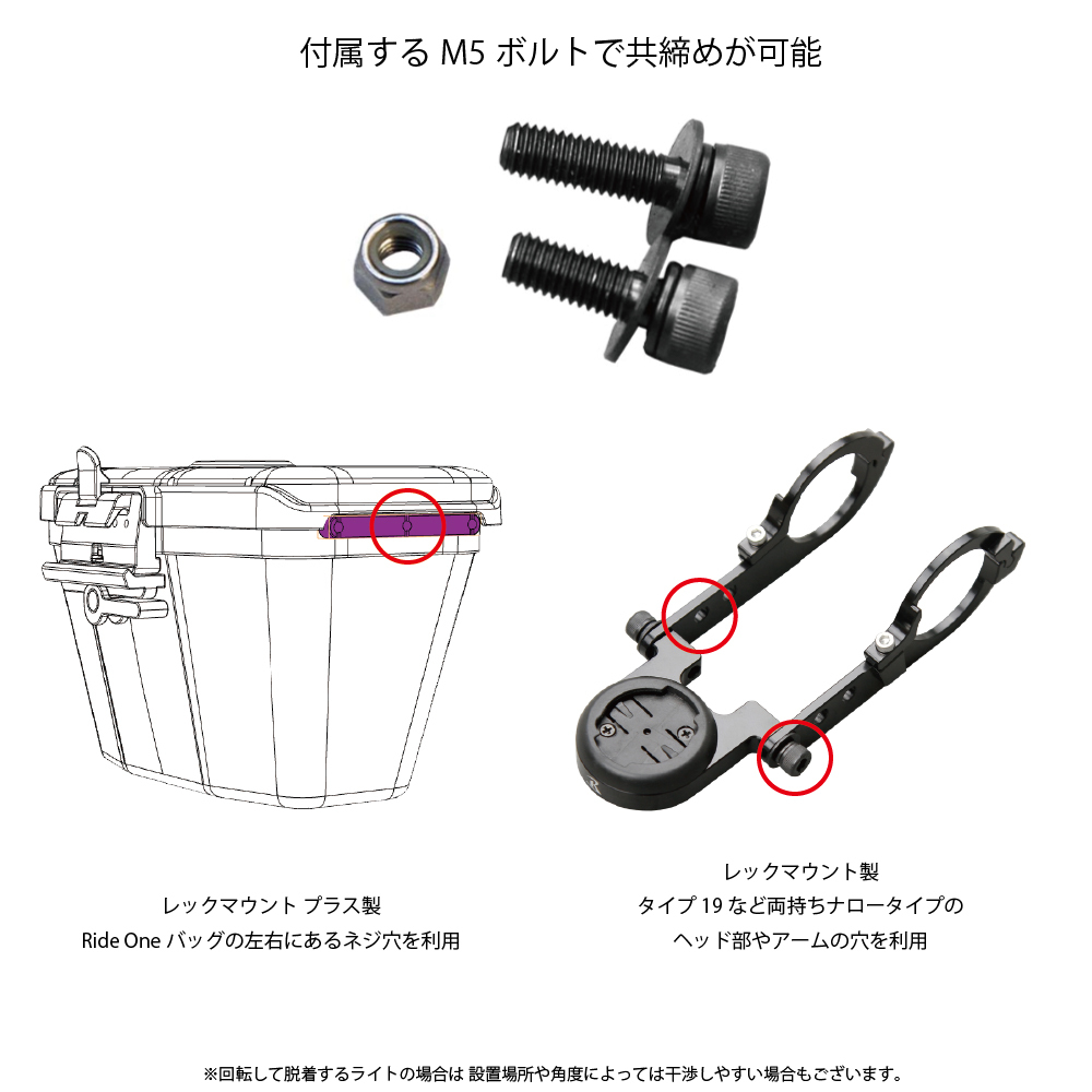 タイプ19のヘッドやアーム・ライドオンバッグ左右にあるネジ穴に共締めが可能