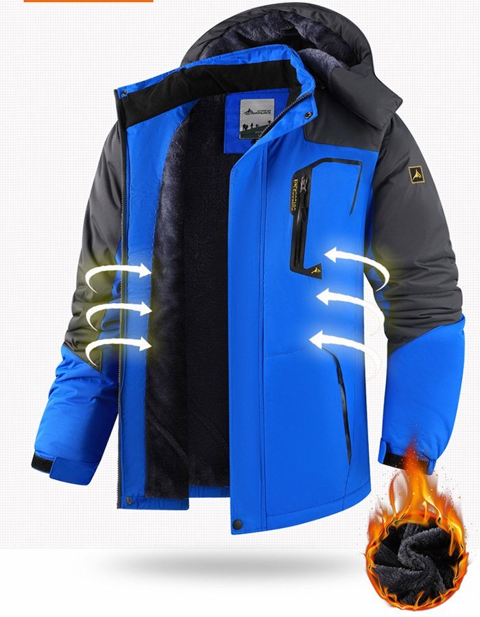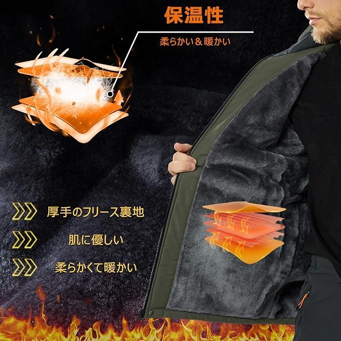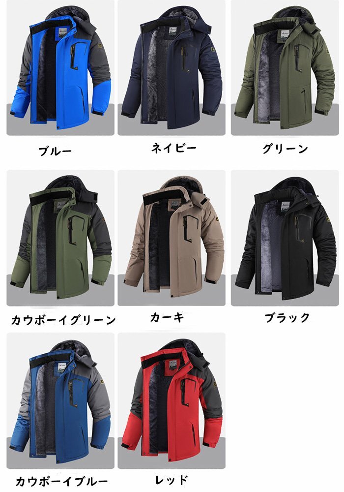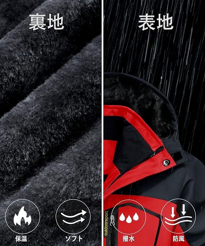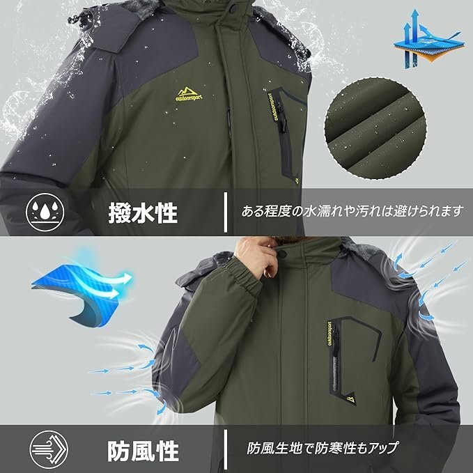 【多機能】1、撥水加工/防汚性/防風性:①防風、防水、防のある機能性生地を採用します。②ファスナーは防水層デザインを付いて、防水性能を高めます。③ジャケットの継手の所に防水工芸を採用します。 2.防寒性/保温性:裏は裏起毛のデザインです。帽子と袖口の設計も保温性を強めます。 3.通気性/透湿性。