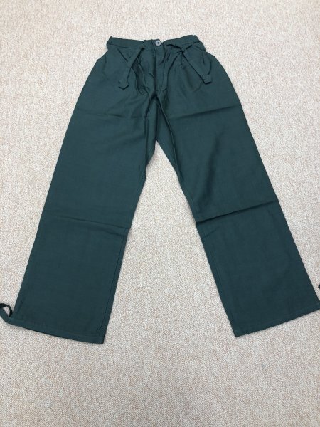 [パンツ] ダブルタック・ウエスト後ゴム入・ウエスト前紐調節・U型小銭入れ付ポケット左右各1・右後ボタン付ポケット・前ボタン、ファスナー付・裾紐調節