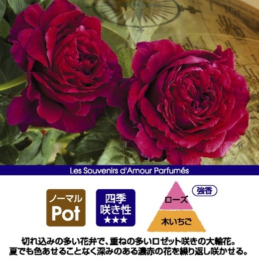 直立したしっかりとした枝の先に、重ねの多いロゼット咲きの大輪。葉は大きく深い緑なので、濃い赤とのコントラストがキレイ。比較的コンパクトでまとまりの良い樹形で、ベランダや狭いスペースでも栽培OKです。「羅針盤のバラ」という意味の名前は、開き始めの花の中心部が、花弁で4つに区切られたようになっているところから付けられています。