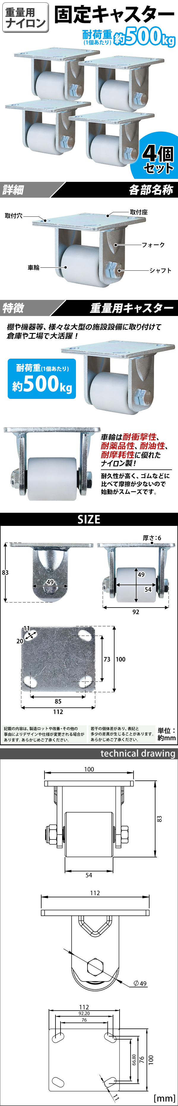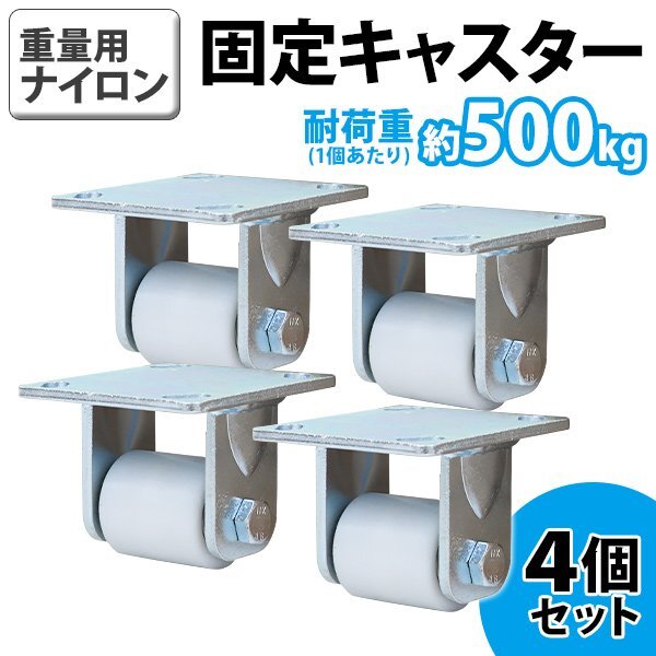 | 商品名 | 送料無料 キャスター 固定キャスター 重量用 ナイロン製 4個セット 重量用キャスター 耐荷重約500kg(1個あたり) 車輪直径約49mm 幅約54mm 固定車 ナイロン車輪 工場 倉庫 作業 運搬 cstrnyfin50r4p |