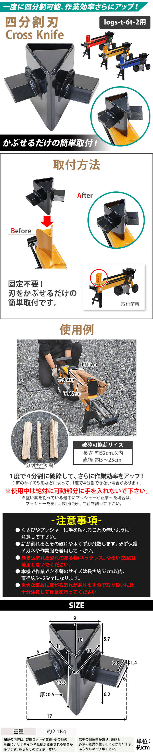 | 商品名 | 送料無料 薪割り機用 電動 油圧 四分割刃 4分割カッター 破砕力約6t ログスプリッター 最大対応薪サイズ直径約25cm長さ約52cm 刃 カッター 四分割 4分割 ブラック 横割り まきわり 薪ストーブ 斧 薪 破砕 木 木材 原木 丸太 家庭用 業務用 黒 logst6t2knife |