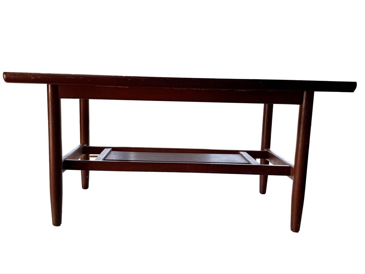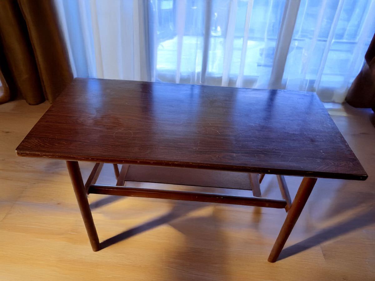 ダークブラウンの天板と丸脚、下段の棚付きで、昭和レトロな雰囲気があります。