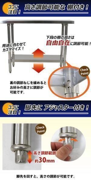 | 商品紹介 | ◆ステンレス作業台◆ ●水に強く錆びにくい、ステンレス製の作業台です。 ●腐食しにくいステンレスSUS304製です。 ●厨房やクリーンルーム等でご使用頂けます。 ●お手入れが簡単な、汚れにくい作業台です。 ●安心してお使い頂ける、頑丈な構造です。 ●高さ調節が可能な棚付き。 ●脚先にはアジャスター付き。 ●シリーズでサイズを豊富にご用意しております。 ※こちらの商品は、組立て式です。 (組立てに必要な工具(4mm六角レンチ)は付属しています。) ●重量:約14kg ●材質:ステンレス(本体)、スチール(ナット) ●耐荷重:約180kg ★ご購入前の注意事項★ ★1階車上でのお渡しとなります。荷降ろし・搬入は、お客様にてお願いいたします。 ●新品商品ではありますが、輸入商品の為、多少の擦り傷などがある場合がございますので、 ご納得の上ご購入下さいませ。 ●ご購入後、お客様ご都合によるご返品、ご返金等は一切お受け致しておりません。 ●本商品を使用した際に発生したトラブル、事故につきまして、当社は一切の責任を負いません。 ご使用に関しましては、全て自己責任にてお願い致します。 |