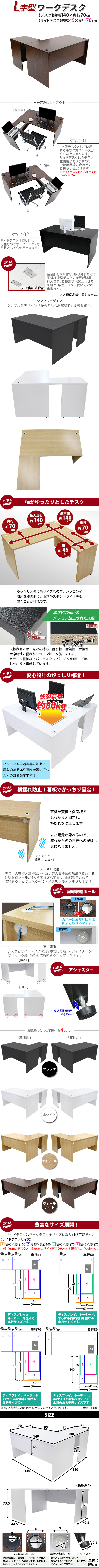 | 商品紹介 | ■作業スペースを広く確保出来る、L字型ワークデスクです。 ■サイドデスクの幅が約45cmのタイプです。 ■会議室や事務所等、オフィス家具として様々なシーンでお使いいただけます。 ■天板には、メラミン加工を施しています。 ■幕板が天板と側面板をがっちりと固定!横揺れを防止します。 ■ネジ穴隠しのシール付き。(サイドデスクのみ付属) ■デスクの天板と幕板に配線収納ホールが2カ所ずつ備わっています。 ■アジャスターで高さの調節が可能です。(高さ調節範囲〜約15mm) ※こちらの商品は、組立て式です。組立てにはプラスドライバーが必要です。お客様でご用意ください。 ※組立図が付属します。 ※サイドデスクの取り付けはデスクの右側専用となります。 ■材質:パーティクル(パーチクル)ボード(メラミン加工)(本体、サイドデスク)、プラスチック(アジャスター、配線収納ホール) ■重量:約48kg(デスク:約35kg、サイドデスク:約13kg) ■総耐荷重:約80kg ●新品商品ではありますが、輸入商品の為、多少の擦り傷などがある場合がございますので、ご納得の上ご購入下さいませ。 ●ご購入後、お客様ご都合によるご返品、ご返金等は一切お受け致しておりません。 ●本商品を使用した際に発生したトラブル、事故につきまして、当社は一切の責任を負いません。ご使用に関しましては、全て自己責任にてお願い致します。 ※カラーはウォールナットとなります。 |