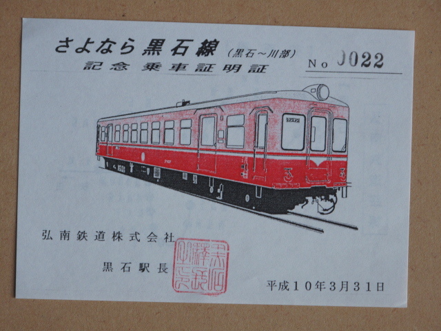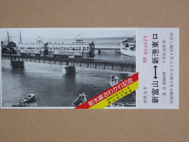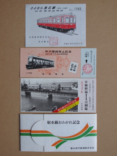 昭和50年5月6日の日付のある、甲子園線廃止 記念乗車券 40円区間券です。裏面は白紙。阪神電車発行。 ② 昭和55年4月1日の日付のある、射水線 おわかれ記念乗車券 1枚 袋入りです。記念切符は1枚のみです。富山地方鉄道発行。 ③ 平成10年3月31日の日付のある、さよなら黒石線 記念乗車証明証です。弘南鉄道 黒石駅長発行印。裏面に路線図。 詳しい内容は、写真欄をご覧願います。 サイズは①がタテ6.2cm×ヨコ 16.0cm、②の袋が8.0cm×16.2cm、③が9.0cm×12.7cm。 いずれも経年の変色がありますg、保存状態は良好です。 定形郵便110円でお送りします。 ★保存状態の記述は、あくまで出品者の主観的な評価ですので、保存状態にきびしい方は、入札をご遠慮願います。
