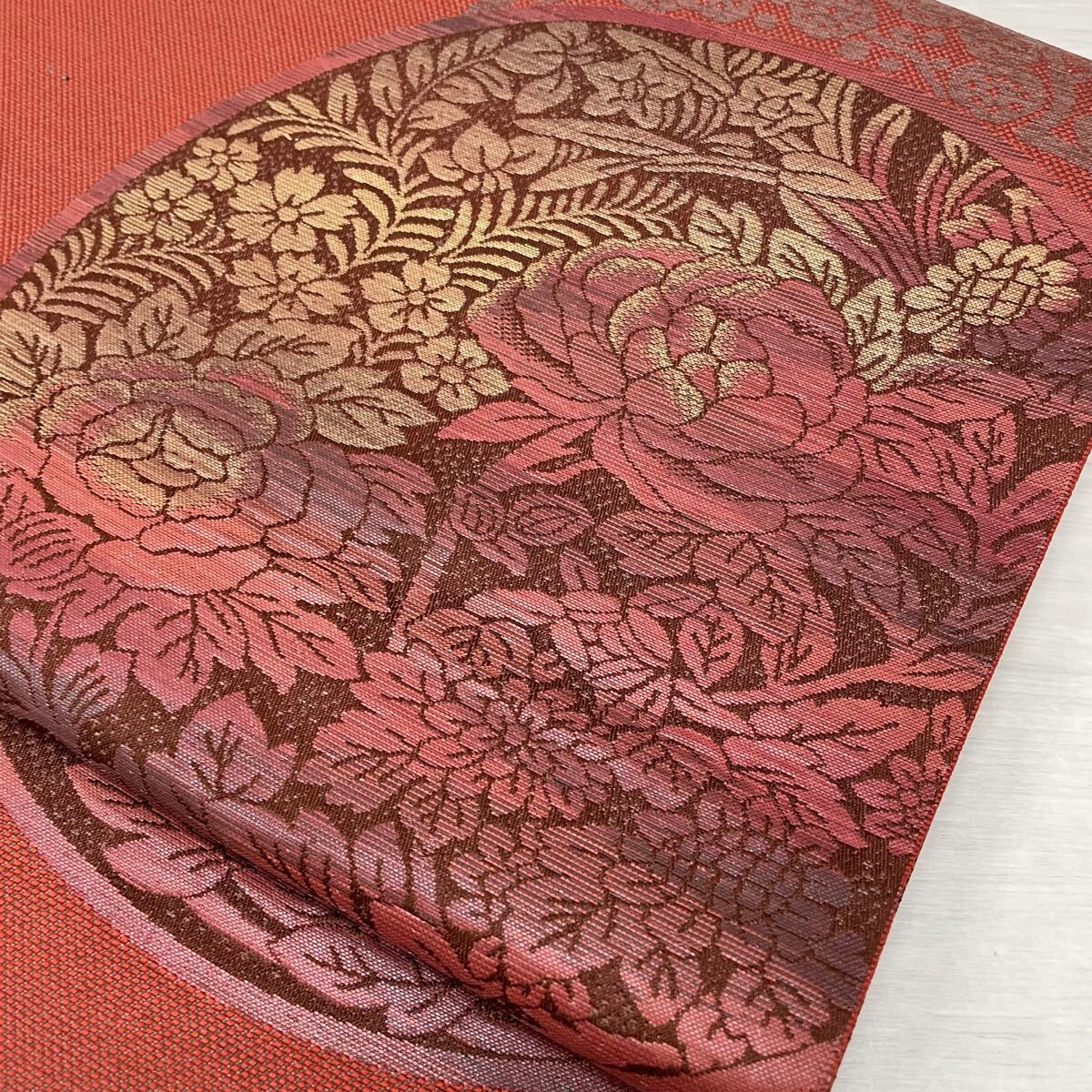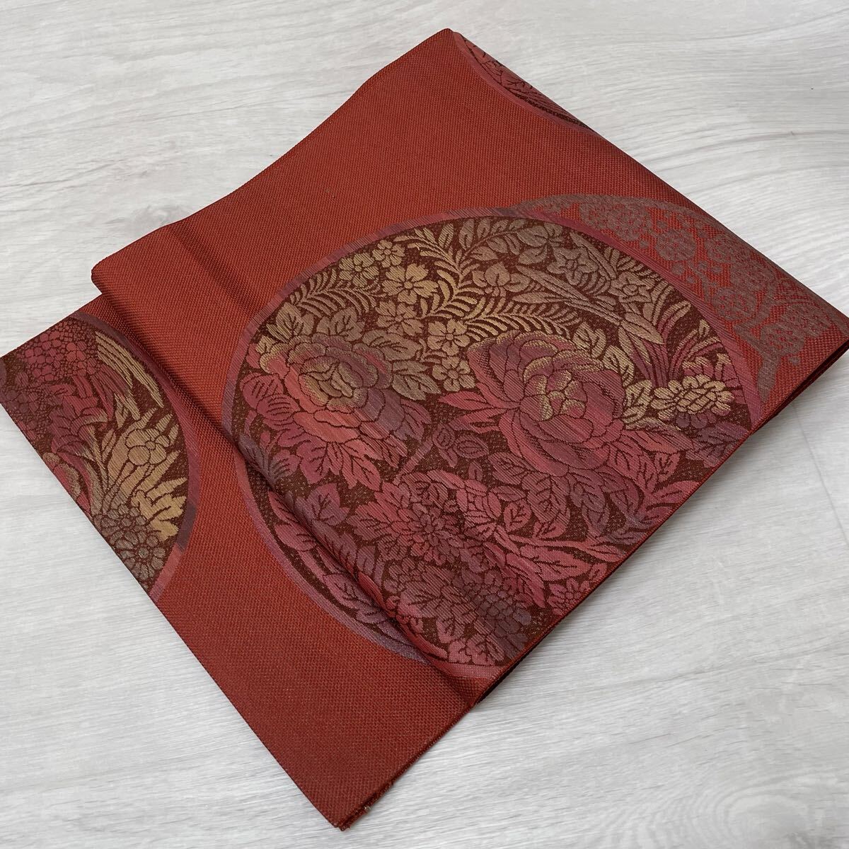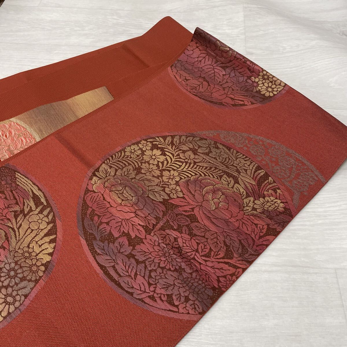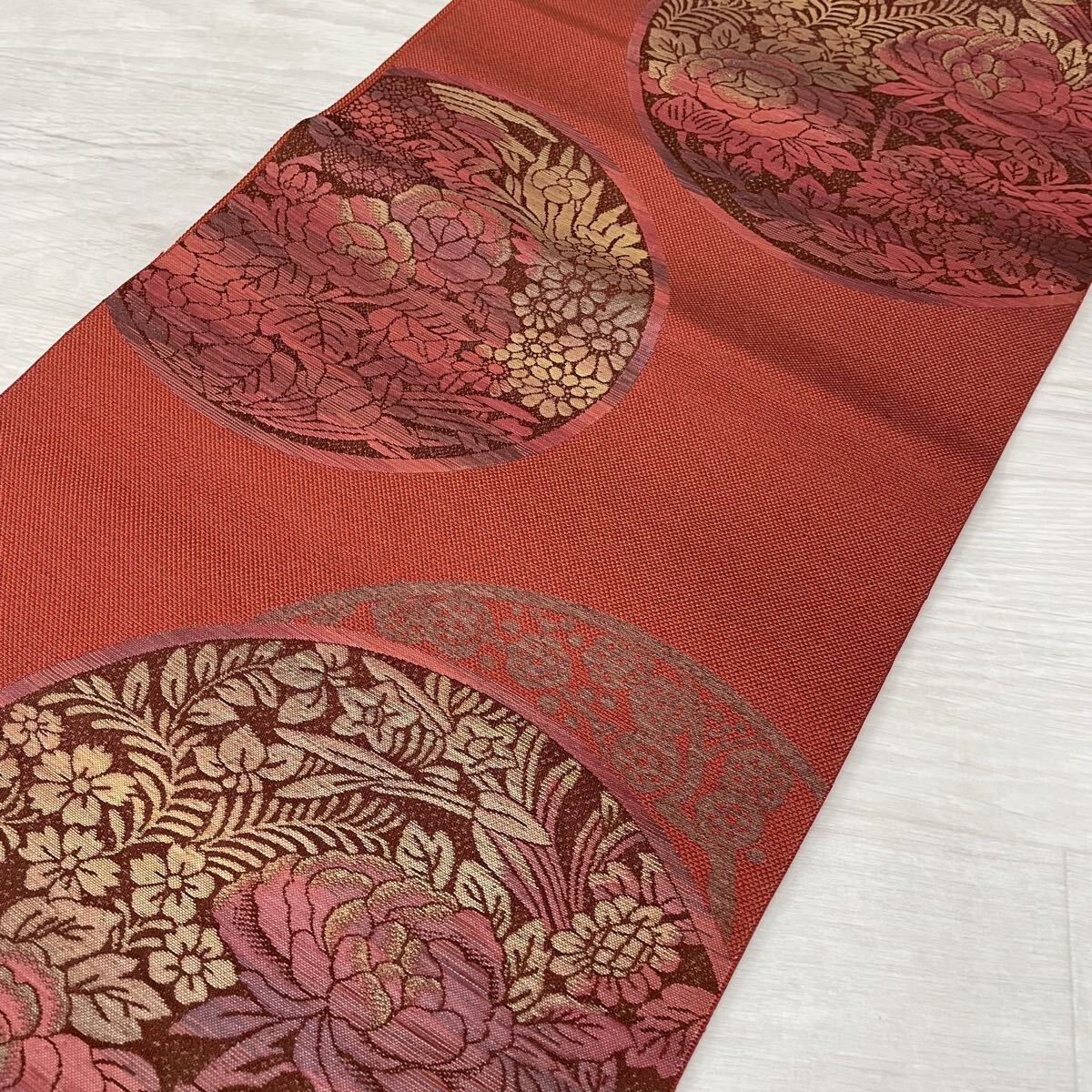 本場筑前博多織 名古屋帯 丸に美しい花模様 八寸 正絹 着物 W-6889