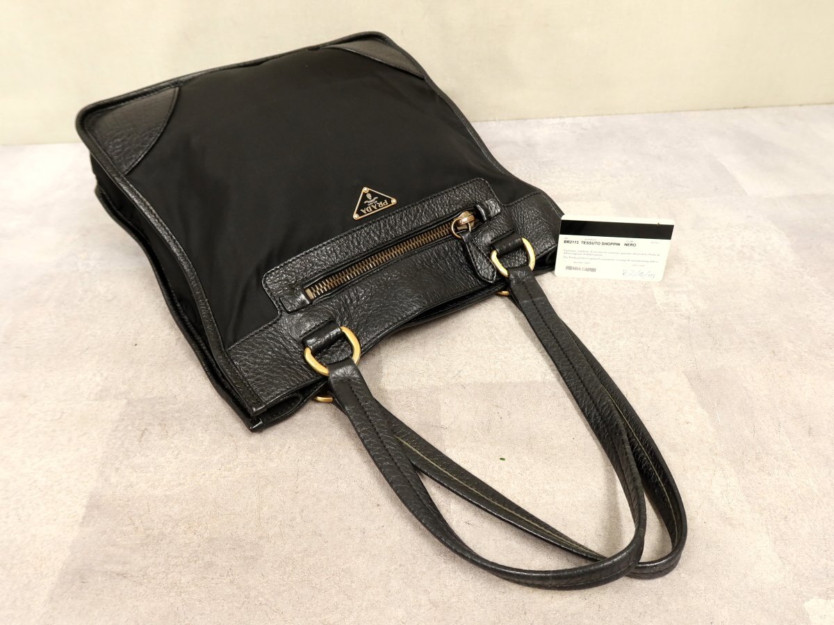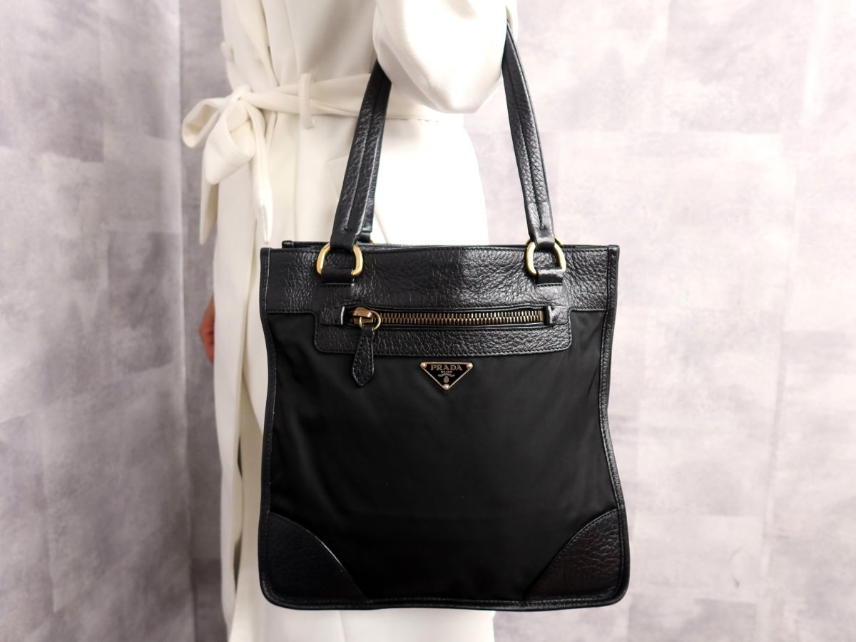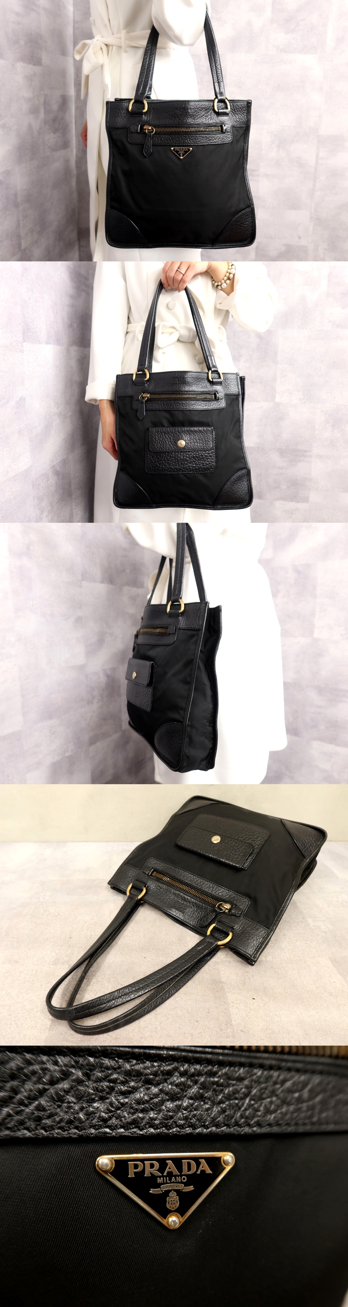 ●超美品●PRADA プラダ●三角ロゴプレート●ポコノ ナイロン カーフ レザー 本革●トート バッグ●黒●ゴールド金具●B5 かばん●Js62399
