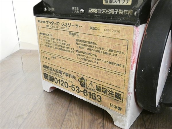 ![]() その他の詳細写真はこちら ← こちらのテキストをクリックして下さい。 商品の状態や細部を可能な範囲で撮影しておりますので、上記のリンクから詳細写真をご覧ください♪ ◆管理番号:N28289 ◆メーカー:末松電機 ◆商品名:電気柵 ソーラーパネル付き ◆型番:ゲッターエースIII ◆寸法:約450(W)×300(D)×500(H)mm ◆動作確認内容 内部にバッテリーが内蔵されております。 今のところ使用できておりますが、消耗等あるかと思われますので、 バッテリーは動作チェック用のおまけとお考え下さい。 ソーラーパネルの取り付け部が割れています。 本体の昼夜稼働、夜間稼働(センサー反応)も確認できております。 実際の出力等は未確認です。 確認は以上です。 使用に伴う、傷、汚れ、スレ、サビ等ございます。 詳細画像をご確認の上ご入札ください。 また付属品につきましては写真のもので全てです。 別途必要な物がございましたら、落札者様の方でご用意ください。 ※注意 ・商品の状態に関して 完全なものをお探しの方や、神経質な方のご入札はご遠慮ください。 当方は専門知識がございませんので、分かる範囲内での確認になります。 また、中古商品ですので、前使用者の方が改造したり修理をしている場合がございます。 輸送中の振動で不具合が起きる場合も有りますので商品の到着後は直ぐに動作確認をお願いいたします。 修理技術がありませんので、万が一不具合等がありましたら返品・返金のみの対応とさせて頂きます。 また、輸送事故も落札金額内での修理しか出来ませんので、修理金額が落札金額を超える場合は返金での対応とさせて頂いております。 ──────────────────────────────────────────────────── ・商品についての詳細は商品説明最上部の 「その他の詳細写真」 にも掲載しております。 ──────────────────────────────────────────────────── 外観(キズ・汚れ)や詳細(型番・付属品等)についても、可能な限りわかりやすく撮影しておりますので、 入札前に必ずご確認下さい。 ・出品商品は写真に写っているもので全てとなります。 ──────────────────────────────────────────────────── 写真になければ付属品はありません。 ・ご使用のパソコンのブラウザや設定により、実物とは異なる色彩表示される場合があります。 ──────────────────────────────────────────────────── ご入札の際にはご注意ください。 ・当方ではPC環境によるお取引を前提として出品しております。 携帯電話(ガラケー)からのお取引の場合は落札後すぐに発送先などの詳細を連絡掲示板にてご連絡下さい。 ──────────────────────────────────────────────────── 携帯電話(ガラケー)からのお取引の際に落札通知が届かない場合がございます。 システム上、携帯電話(ガラケー)からのお取引が困難な場合もございます。 ご了承下さい。 他にも多数出品していますので、そちらの方もよろしくお願いいたします! 出品中の商品一覧はこちら |