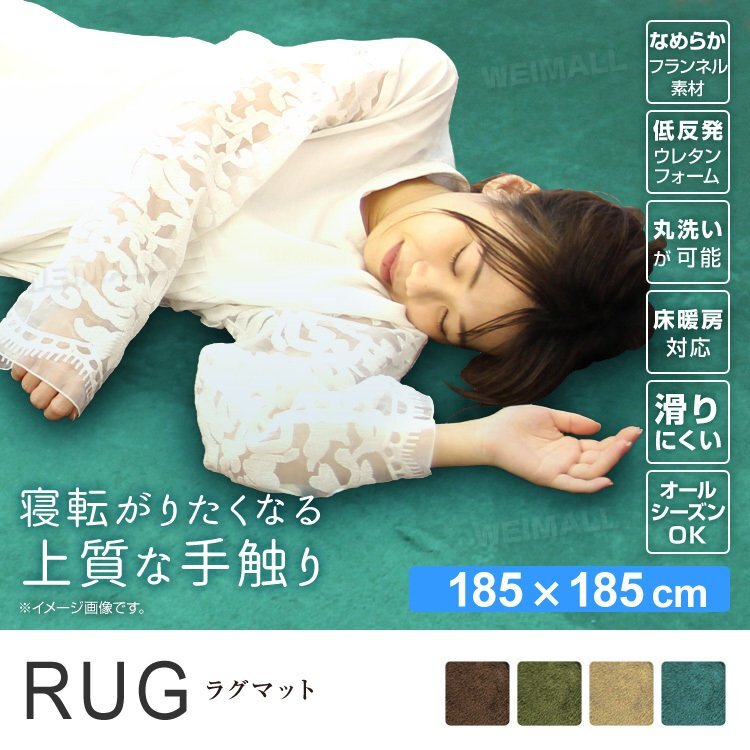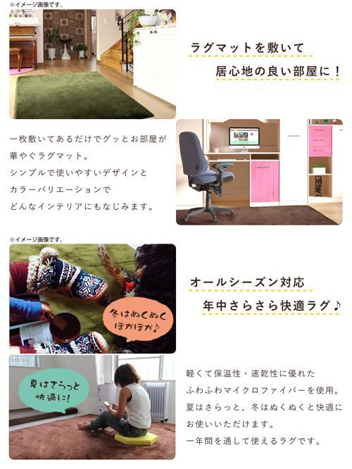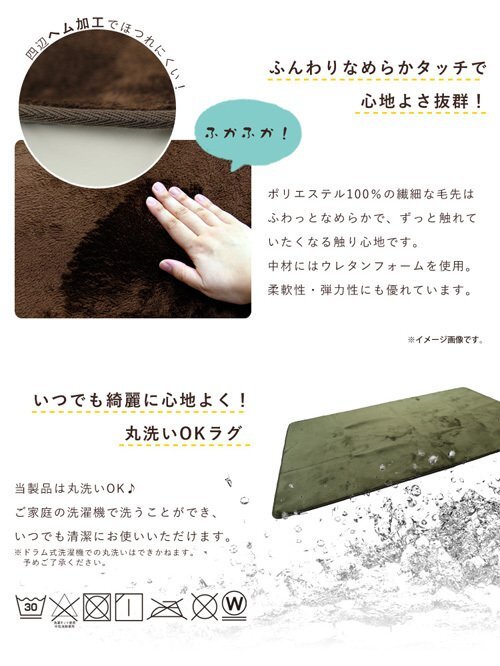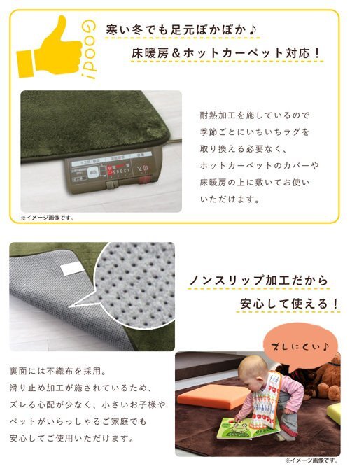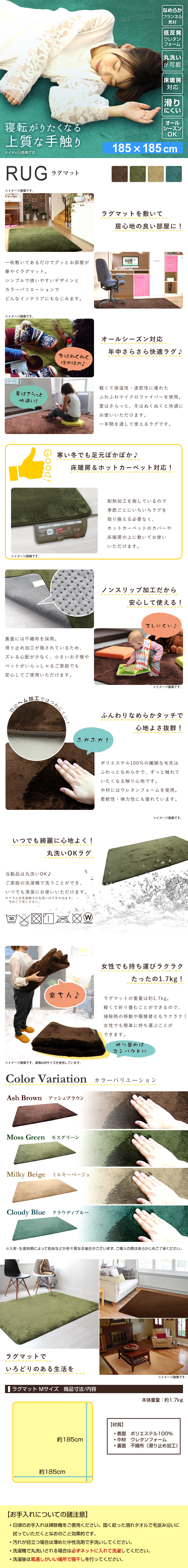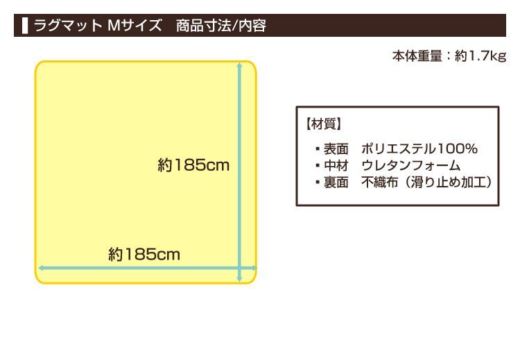 夏はサラッと、冬はあったか。 オールシーズン!快適に使えるラグマットです。 ソファーの前にテーブルを置いた際に使い勝手が良く、いろいろなタイプのお部屋に合わせやすいサイズです♪ 裏面にはゴム製の滑り止め加工が施してあり、フローリングに敷いても滑りにくく、小さなお子様やペットがいらっしゃるご家庭でも安心です! 毛足が短く、表面がサラサラなので簡単にお掃除ができ、洗濯機での丸洗いもできるのでいつでも清潔にご使用いただけます。 床暖房やホットカーペットに対応しているので、なめらかな肌触りを1年中楽しむことができます!! 【商品仕様】 カラー:ミルキーベージュ サイズ(約):185×185cm 重量(約):1.7kg 素材: ・表地:ポリエステル100% ・中材:ウレタン ・裏面:不織布(滑り止め付) |