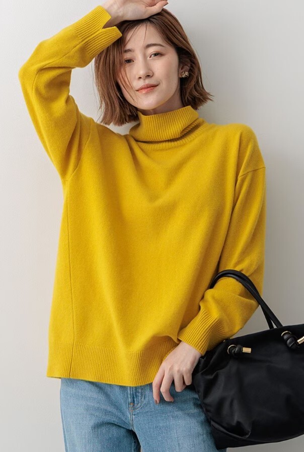 贅沢にカシミヤ100%で仕立てた天竺編みタートルネックプルオーバー。