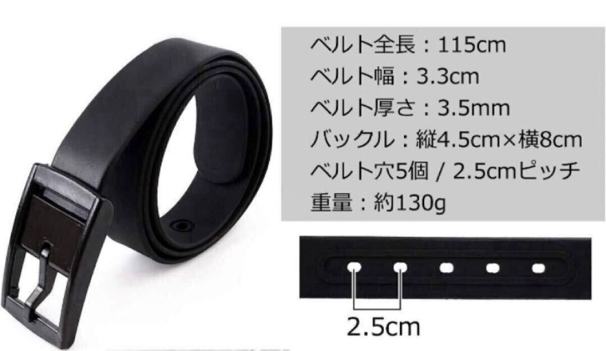 最大ウェストサイズは103cmに対応します。長さは、バックル からベルトを外し、ハサミなどで短くカットできるので、お好きな長さに調整が可能です。5ヵ所あるベルトホールの間隔は約2.5cm