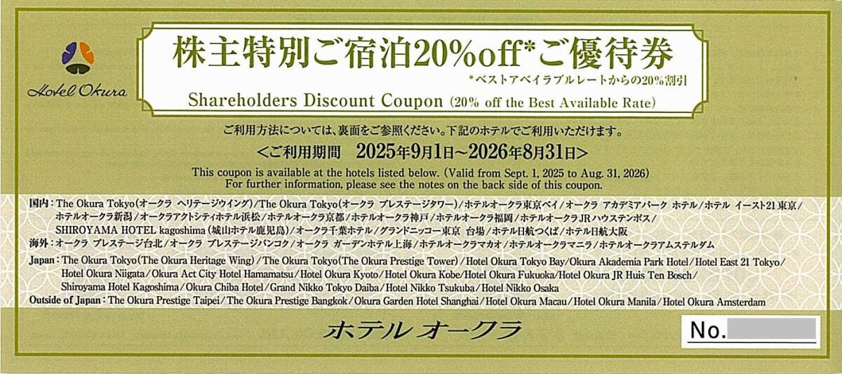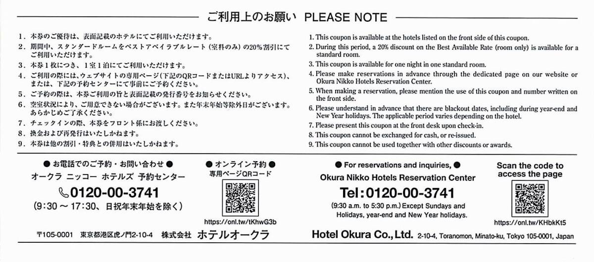 有効期間は「2026年8月31日」までです。 本券1枚につき、1室1泊のご宿泊がベストアベイラブルレートから20%割引になります。 ご利用の際は、専用ウェブサイトや予約センターにて事前のご予約が必要です。 ※詳細につきましては、画像をご覧ください。 |