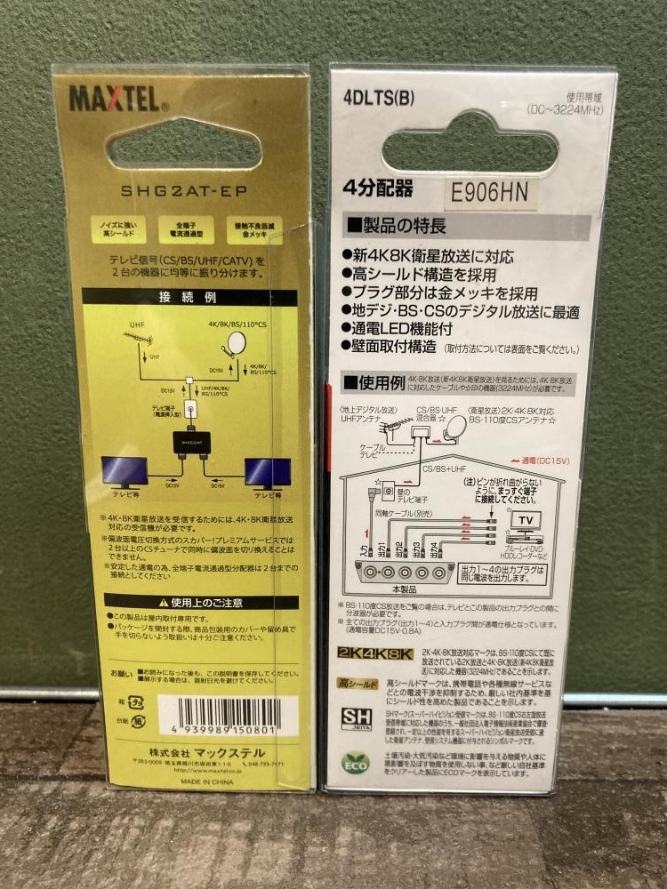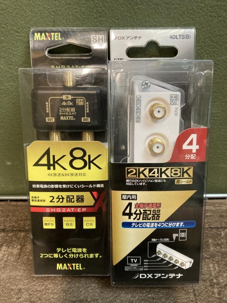 DXアンテナ、MAXTEL ■商品名 2分配器、4分配器 ■型番 SHG2AT-EP、4DLTS(B) |