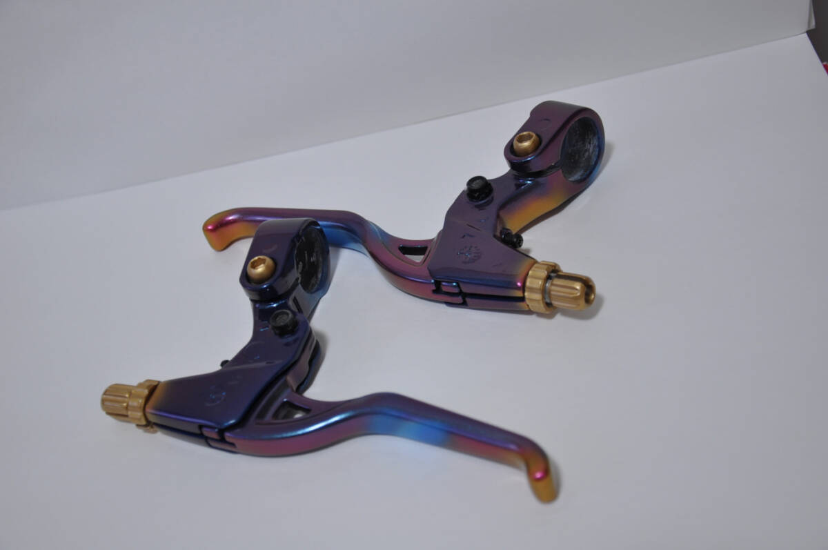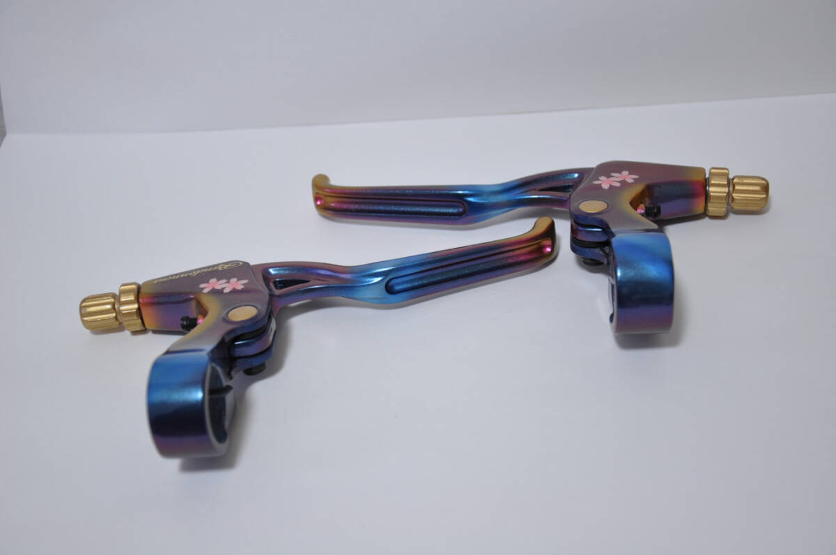 特殊塗料で塗装しており、全体的にメタリックブルー~ワインレッド。レバー先端は、ワインレッド~ゴールドに変色します。一見するとオイルスリックとやや似ておりますが、光の加減で色が変化する塗装です。