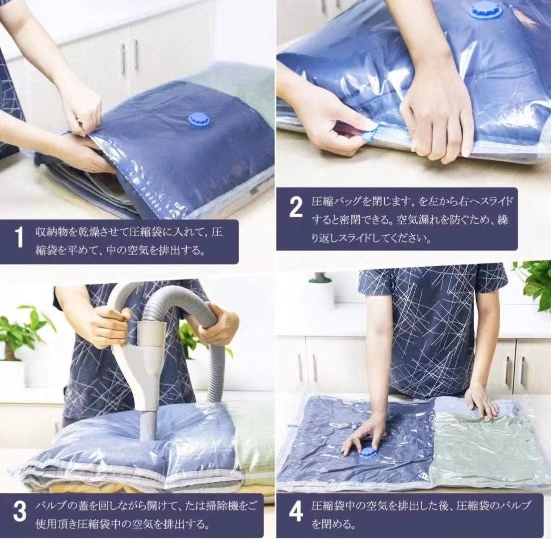 洋服/布団/ふとん圧縮袋になります。 セット内容  商品番号:M/L/XL ◆M60*80 CM-----2枚 ◆L:100*80 CM----2枚 ◆XL:130*100CM----2枚 材 質 圧縮袋:ポリエチレン・ナイロン スライダー:ポリプロピレン 【使用方法】 STEP1:収納物を充分に乾燥させて、大きさに合わせ畳んでから圧縮袋に入れる。 STEP2:圧縮袋を平めて、中の空気を排出する。 STEP3:チャックを止めてからスライダーを左から右へスライドすると密閉できる。空気漏れを防ぐため、繰り返しスライドしてください。 STEP4:バルブの蓋を回しながら開けて、手動ポンプまたは掃除機をご使用頂き圧縮袋中の空気を排出する。 STEP5:圧縮袋中の空気を排出した後、圧縮袋のバルブを閉める。 STEP6:家に掃除機があったら、掃除機のホースの先をバルブに垂直にあてて、吸引を始め、圧縮が終わりましたらホースをバルブから離すだけで完了です。 ※ ご注意:ごバルブの中に空気漏れ防止の透明のシリコンは絶対抜かないでください。 【注意事項】 1.ご使用の前に衣類などを十分に乾燥してください。革製品と食品は袋に入れないでください。 2.できるだけ袋の奥まで入れて、せめてスライダーのファスナーから何センチの距離を残してください。 3.密封性を保証するために、スライダーを繰り返して開け閉めてください。 4.バルブの中に空気漏れ防止のピンク色のシリコンがあるので、是非抜かないでください。 5.乳児や幼児の手の届かない場所に保管してください。袋をかぶって窒息するなどの危険性があります。本品は衣類を圧縮収納するための袋です。用途以外の目的で絶対に使用しないでください。 6.熱や火にを避けて、釘・針・刃物等で傷つけないでください。