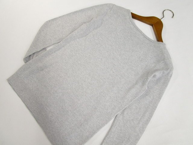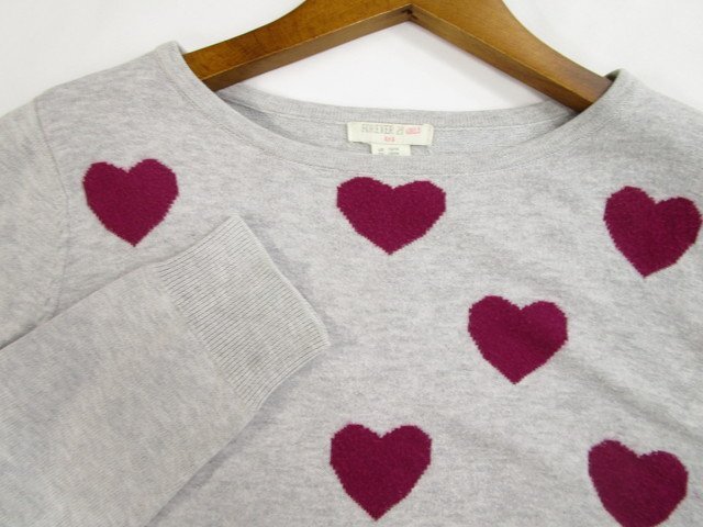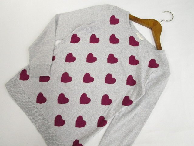 洗える 長袖 ラウンドネック ニットカットソー XL ライトグレー パープル ハート柄 【メール便可】