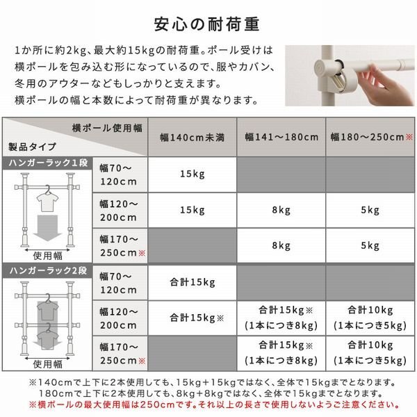 床と天井があれば、お部屋のどこでも使う事が出来る、おしゃれなつっぱりハンガーラック! 質感にこだわったデザインで、ざらりとした質感が高級感を演出します。 壁一面を衣類収納にしたり、ベッドサイドでコンパクトに使ったりできます。 また洗面所で使用したり、部屋干しをする際にも使用することができます。 横ポールが2段あるのでたっぷり収納できます。 高さ調節することができるのでコートなど丈が長い衣類も収納できます。 |