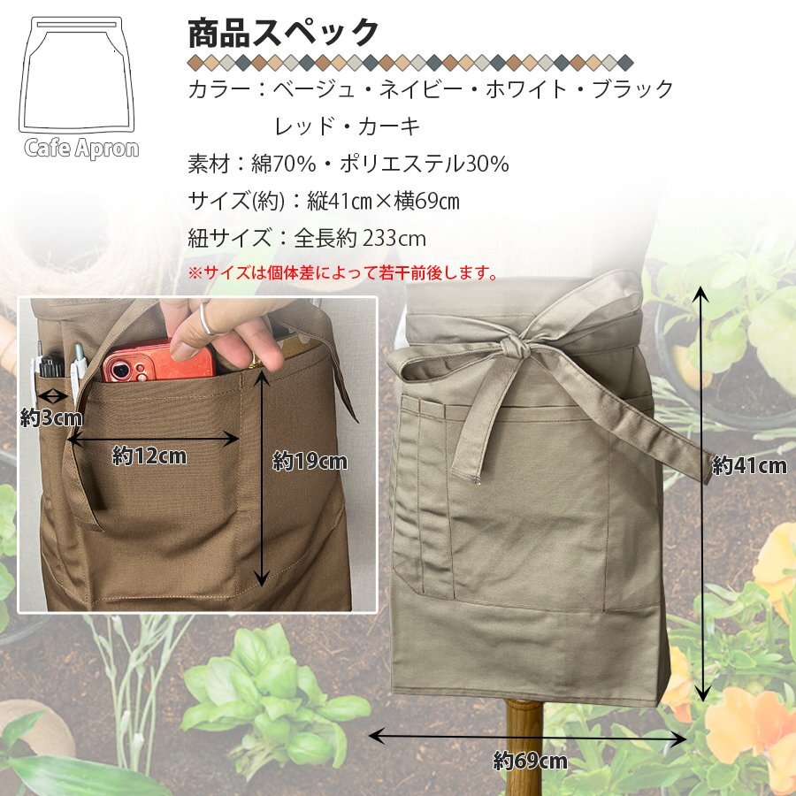 | 商品名:カフェエプロン サイズ:約 縦41cm×横幅69cm(平置き採寸です。) 紐サイズ:全長約233cm 生産地:中国 カラー:ベージュ・ネイビー・ホワイト・ブラック・レッド・カーキ 素材:綿70%・ポリエステル30% |