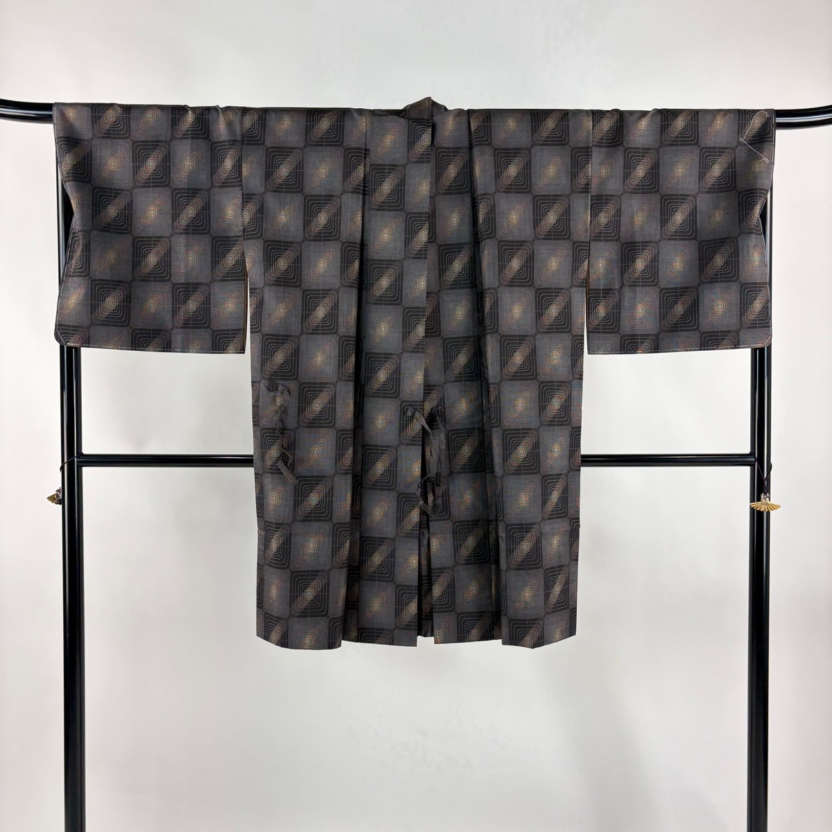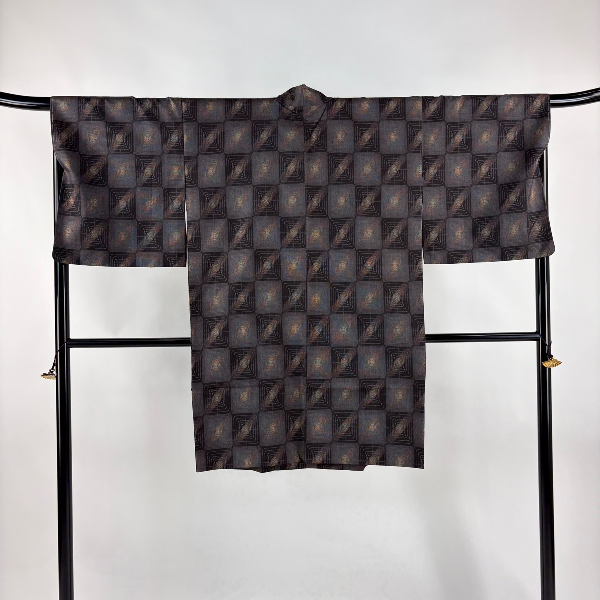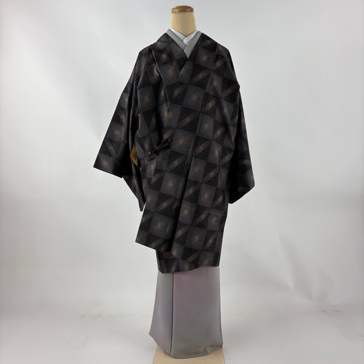 | 道中着 美品 秀品 和装コート 紬地 ほていや 渦巻き 幾何学 焦茶色 身丈101 裄丈67 M 正絹 【中古】 |