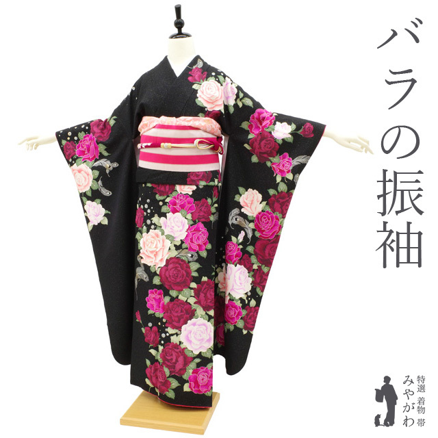 振袖 リサイクル 着物 正絹 成人式 フォーマル 黒地 銀通し 薔薇 バラ 刺繍 中古 仕立て上がり 身丈160 裄丈67 Mサイズ みやがわ sb15307