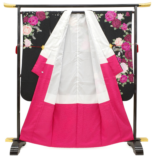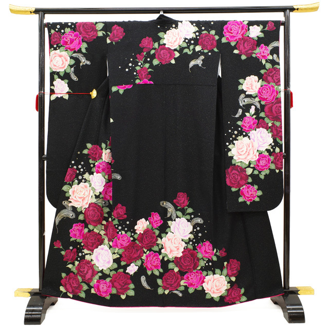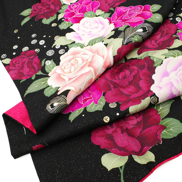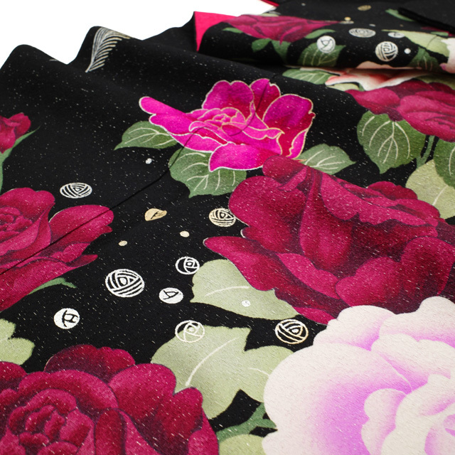 裾や袖、衿元には、ローズピンクやピンク、白で描かれたバラが咲き誇り、洋の雰囲気を感じさせるエレガントな柄行が印象的な一枚です。