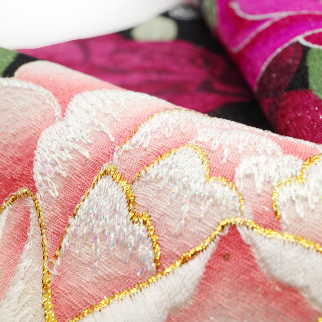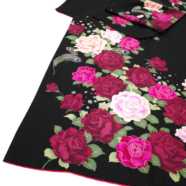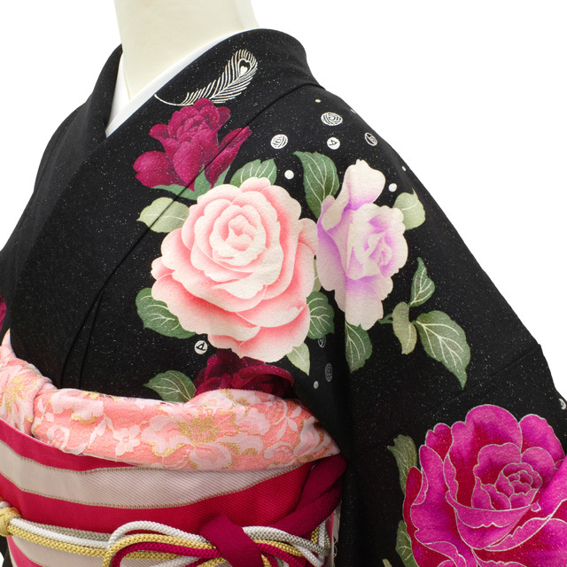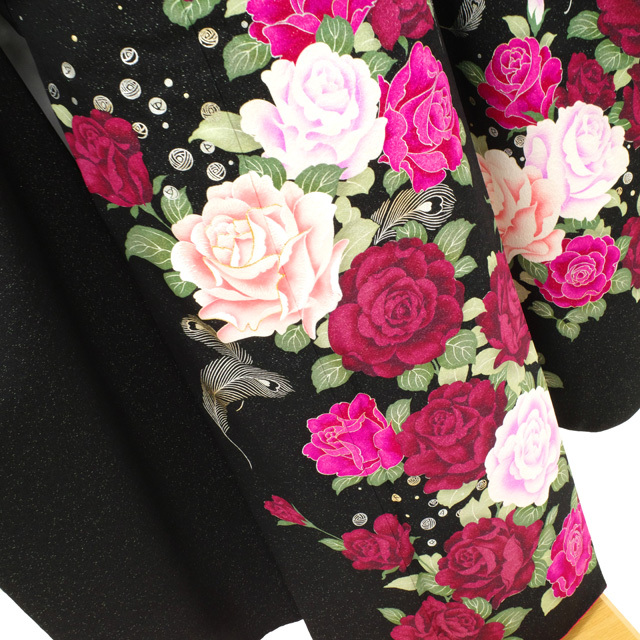 中でも上前にあしらわれたバラには、きらめく刺繍がほどこされており、光を受けるたびに美しく輝き、晴れの日の装いを一層引き立ててくれます。