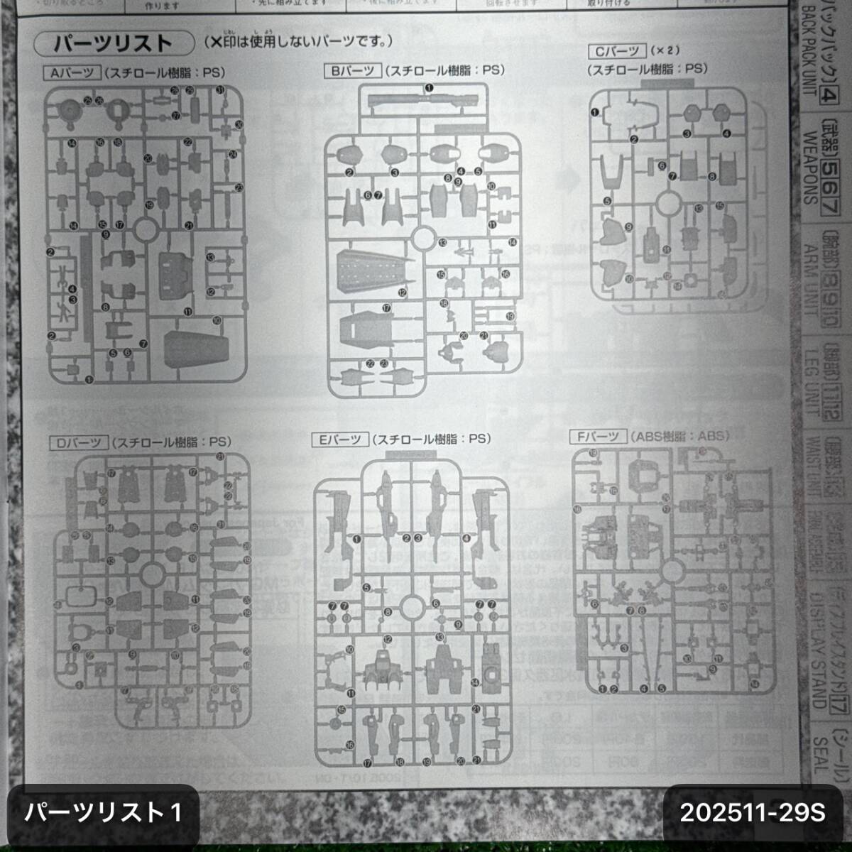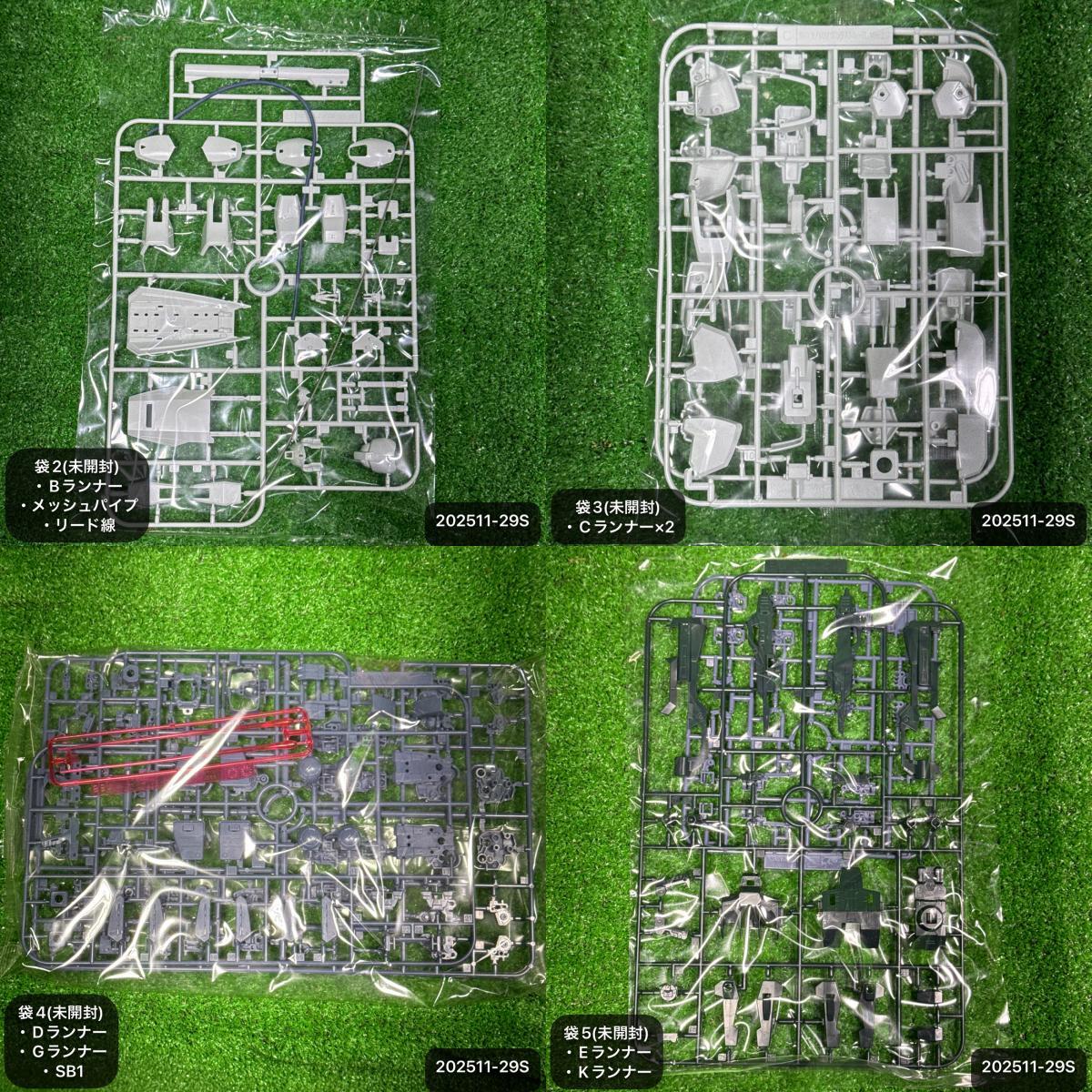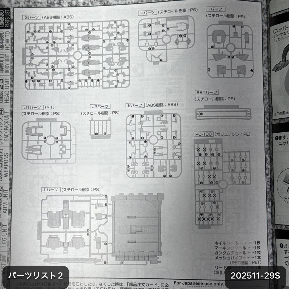 【セット内容】 ・Aランナー ・Bランナー ・Cランナー ×2 ・Dランナー ・Eランナー ・Fランナー ・Gランナー ・Hランナー ・Iランナー ・J1ランナー ×2 ・J2ランナー ・Kランナー ・Lランナー ・SB1ランナー ・PC-130 ・ガンダムデカール ・マーキングシール ・ホイルシール ・メッシュパイプ ・リード線 ・その他パーツ一式 ・説明書 ×1