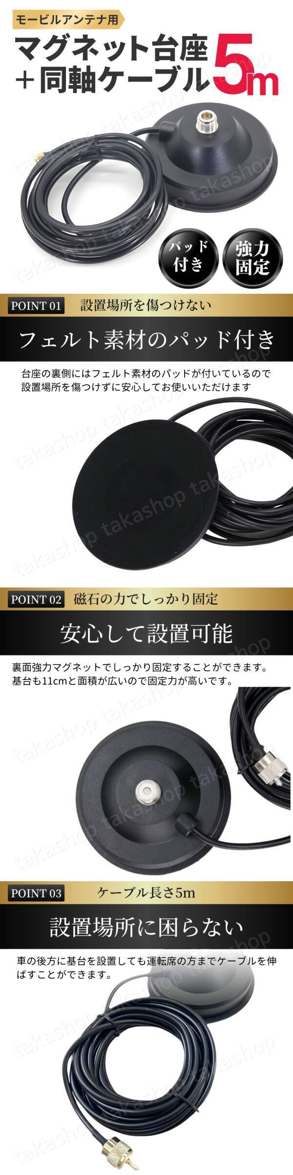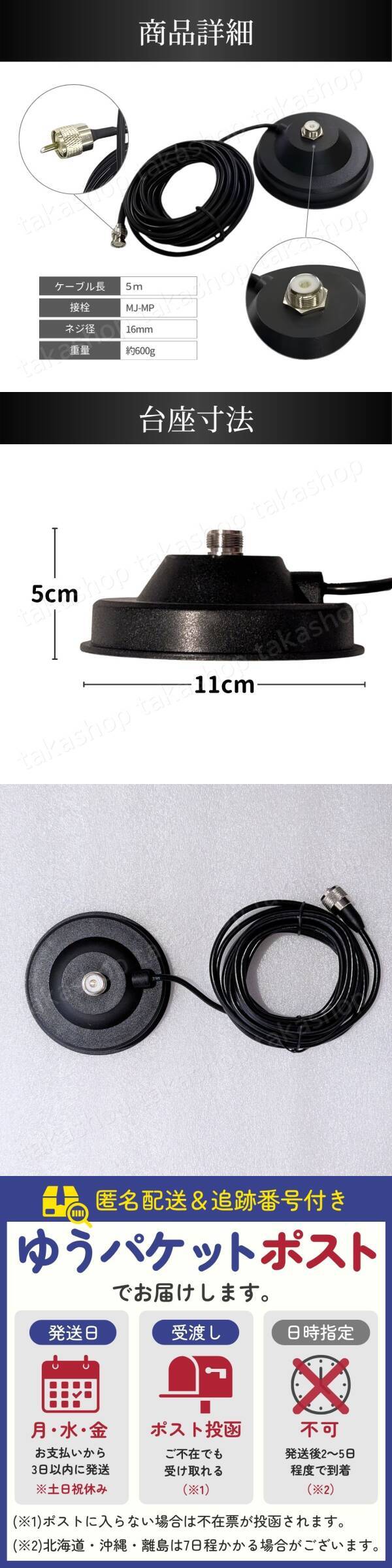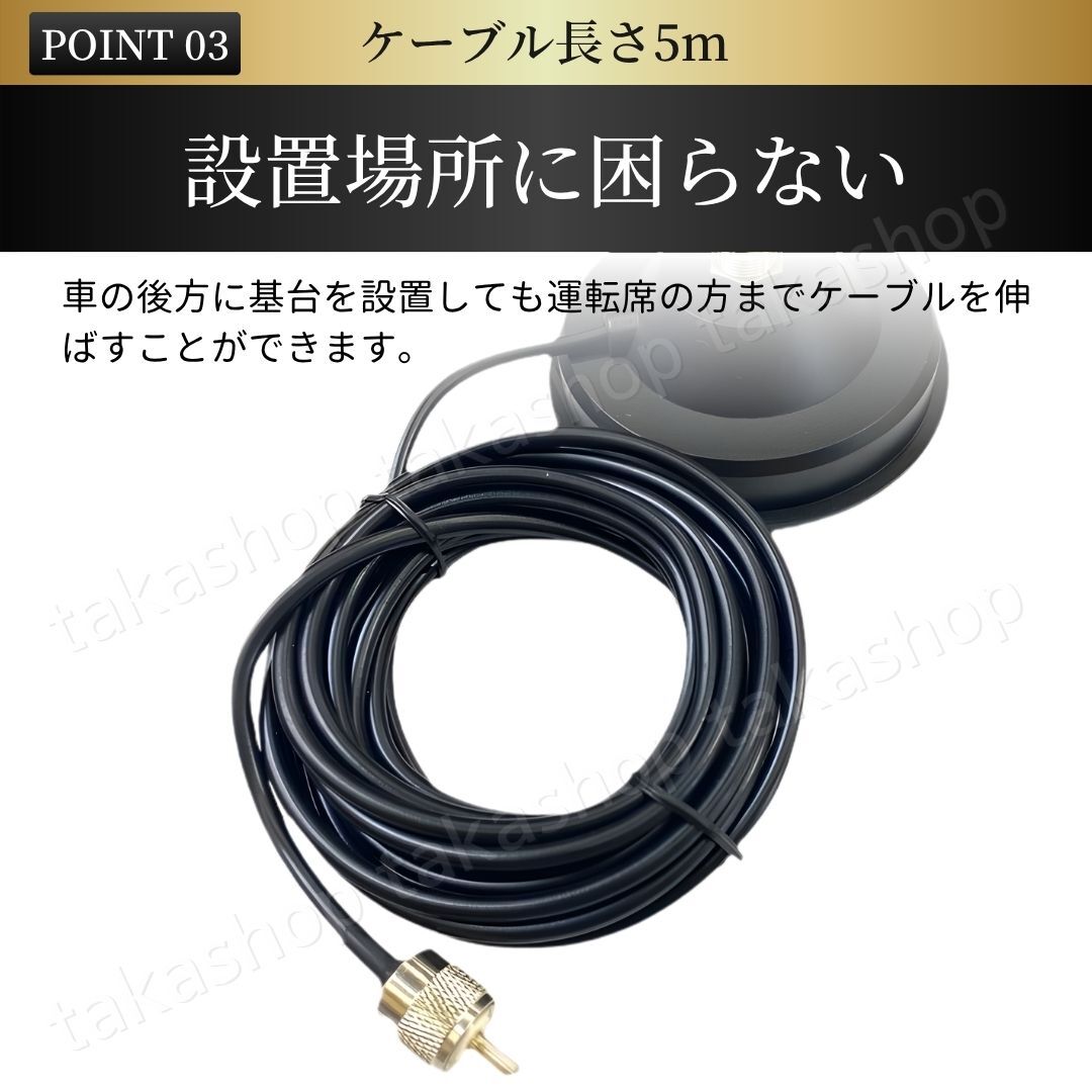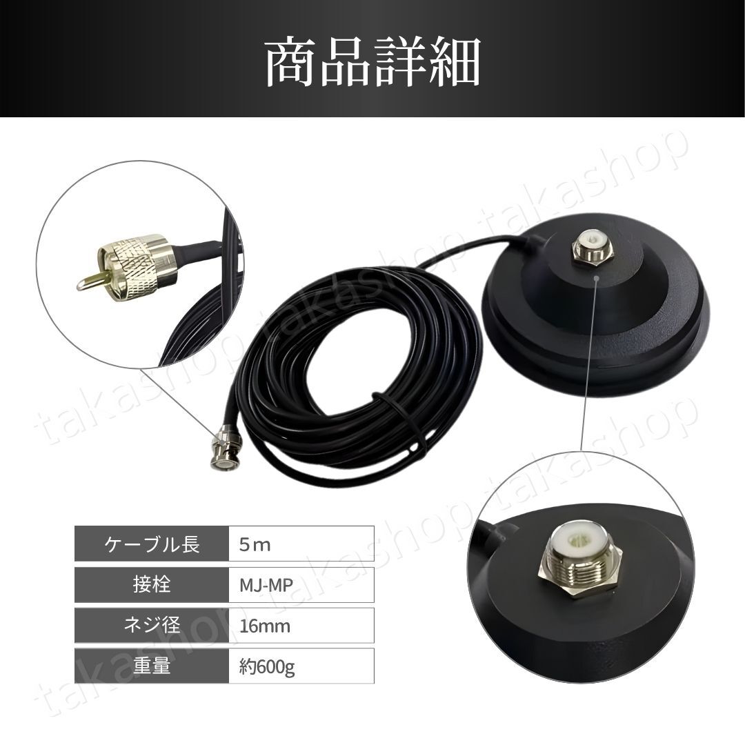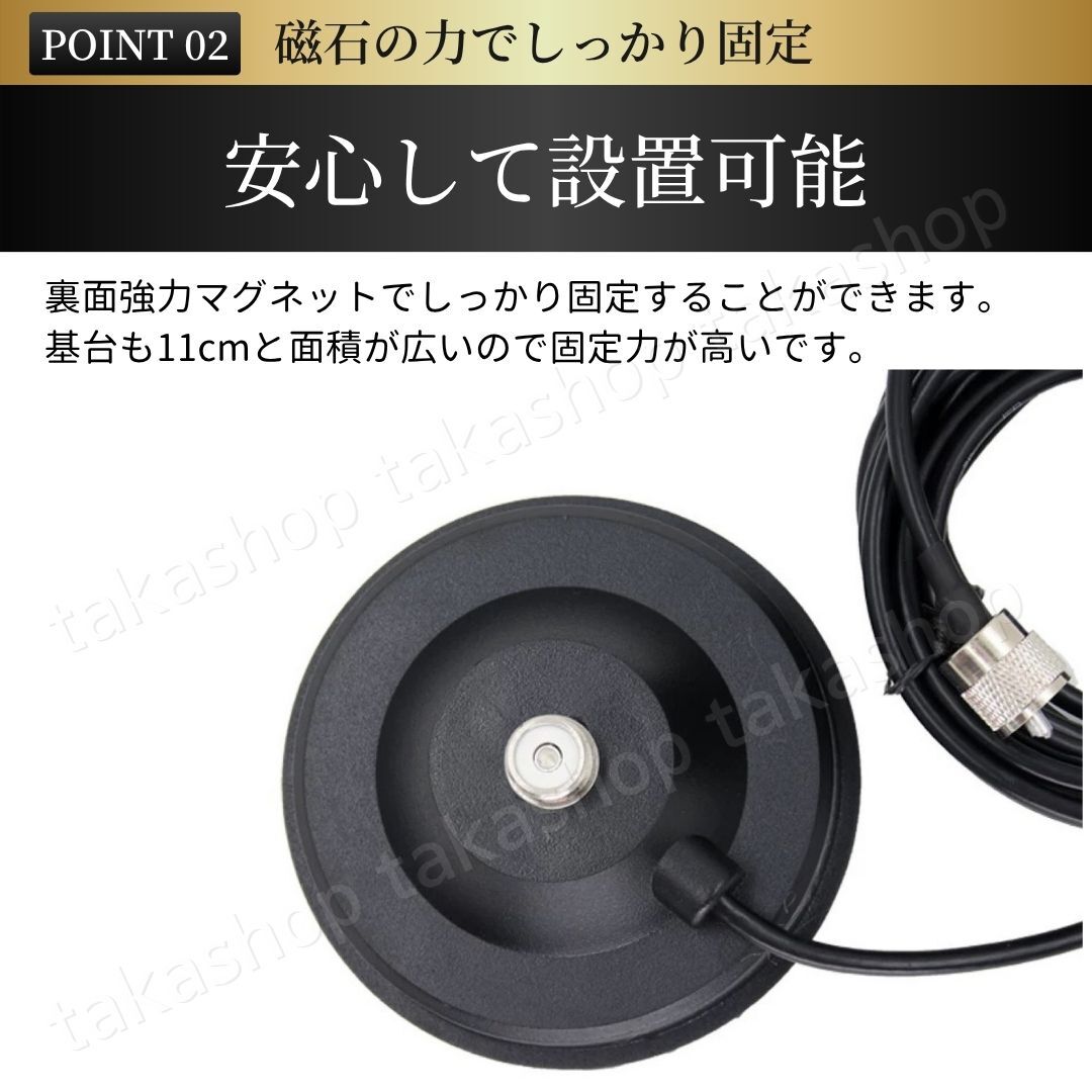 | 商品説明 | ご覧いただきありがとうございます。 ●商品説明 モービルアンテナ用のアンテナ基台と同軸ケーブル(5m)のセットになります。 強力マグネット付きの基台でしっかり固定することもでき、フェルト素材のパッド付きなので接地面を傷つけずに使用できます。 同軸ケーブルは5mあるので車の後方・大型車・船舶やベランダなど幅広く使うことができます。 ●商品特徴 ・設置場所を傷つけない 台座の裏側にはフェルト素材のパッドが付いているので、設置場所を傷つけずに安心して使用できます。 ・磁石の力でしっかり固定 裏面強力マグネットでしっかり固定することができます。 また、基台も直径11cmと面積が広いので固定力が高いです。 ・ケーブル長さ5m 車の後方に基台を設置しても運転席までケーブルを伸ばして使用することができます。 ●商品詳細 ケーブル長:5m RG-58 接栓:MJ-MP 基台寸法:直径11cm、高さ5cm 重量:約600g 内容:アンテナ基台+同軸ケーブル5m ※梱包・発送方法の関係で外箱から取り出し、本体と付属品のみ(写真No.8)で発送いたします。 ●発送について 【宅急便コンパクトで発送します】 発送日 :お支払い後1〜3日以内(平日) 到着目安:発送後2〜4日程度 ※遠方の方はもう少しかかる場合もございます 【配送方法の変更はできません】 ●お願い ・商品画像の転載や説明文のコピーはお止め下さい ※見つけたら通報しています ・ 海外製品のため、細かな汚れや傷がある場合があります。予めご了承ください ・即購入OK 〇初期不良は対応しますので、何かあれば「評価前に」ご連絡下さい |