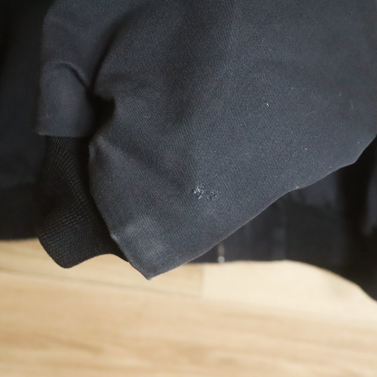 中古品です。使用感があります。写真にあるように各所に擦れ、汚れ、袖に擦り切れ破れ、リブにホツレがあります。