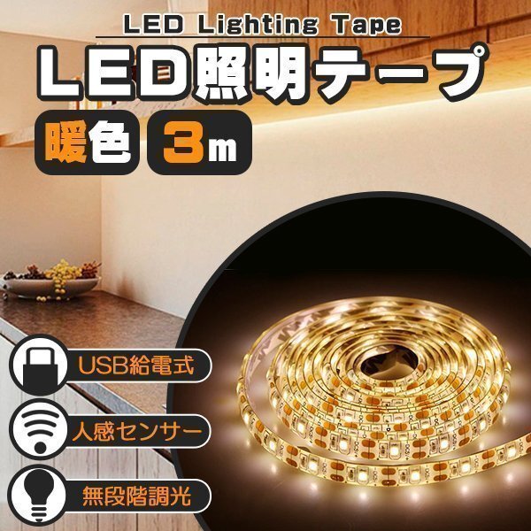LED テープライト 人感センサー付き 3m 暖色 電球色 USB式 LEDテープ 階段 間接照明 棚下照明 フロアライト 足元灯 無段階 調光対応