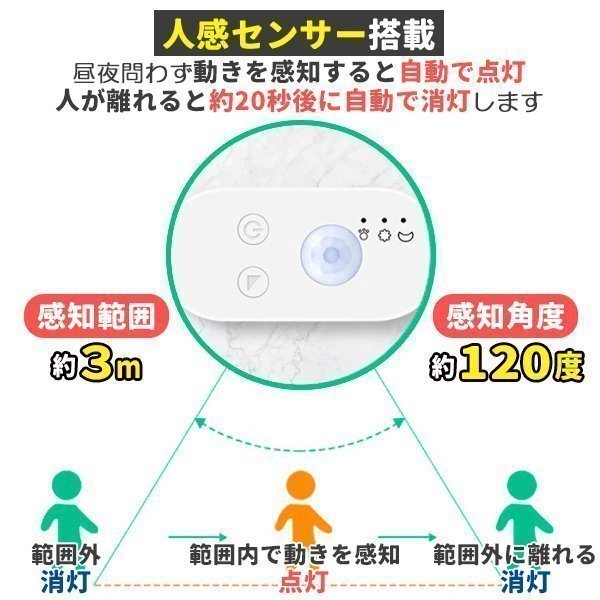 昼夜問わず、動きを感知すると自動で点灯し、人が離れると約20秒後に自動で消灯します。