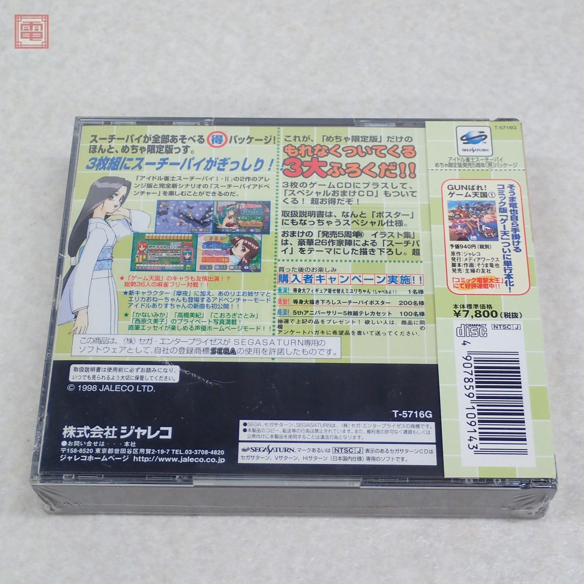 未開封 SS セガサターン アイドル雀士 スーチーパイ めちゃ限定版 発売5周年 得パッケージ ジャレコ JALECO ■未開封と判断しましたので、未チェックのままお譲りします。万が一、開封済み品であった場合はご容赦ください。 ■こちらの商品は未開封のままでお譲りいたします。 ■未開封品は未開封である事に価値があるため開封後のクレームや返品に応じる事は出来ません。 ■外装にスレ、キズ、汚れ、ヤケ、破れがあります。 ■上記以外は未チェックです。 ■こちらの商品は18歳以上が対象です。 ■写真のものが全てです。付属物の有無や状態については写真からご判断ください。 ■チェックに使用したモニターやチェック機器等は、特に表記がない限りは付属いたしません。 ■商品到着後、当店の保証期間中は、商品及び箱や取説、付属品などを1つでも廃棄や破損をしないようにお願い致します。廃棄や破損をした場合、商品に問題があった場合でも対応や返金などの対処ができなくなります。 | |||