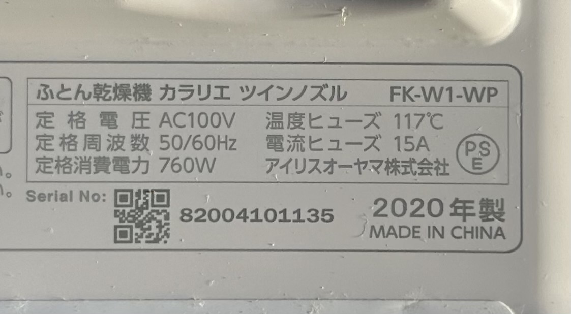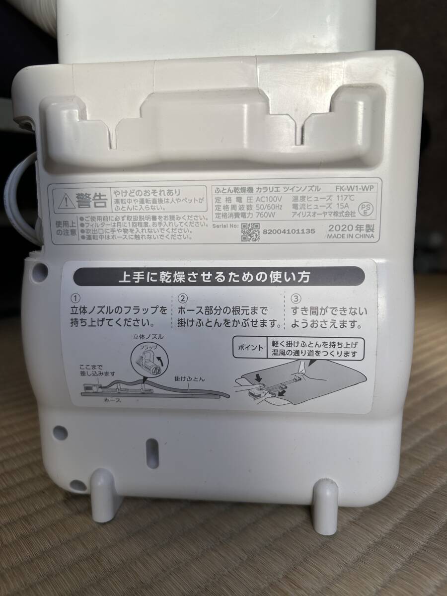 IRIS OHYAMA FK-W1、布団乾燥機、2020年製、