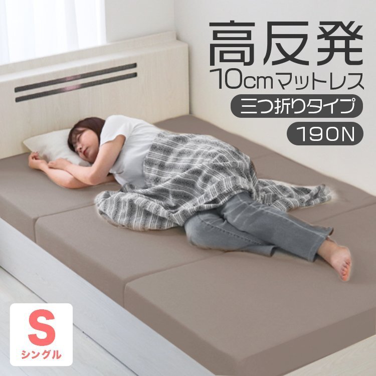 | 厚みたっぷり10cm! 適度な硬さで身体をしっかり支える、三つ折りタイプの高反発マットレスです。 柔らかいマットレスとは違い、身体の沈み込みを軽減した腰に優しい寝心地です。 高反発マットレスのウレタンフォームは弾性が高く、 適度な硬さで身体を支えるので、底つき感もなくへたりにくいマットレスです。 寝返りが多い方や仰向けに寝ることが多い方におススメです。 簡単にたためる三つ折りタイプなので、お部屋で立て置きして日当たりのいい場所で部屋干しが可能! 取り外しやすいL字ファスナー付き洗えるカバーが付属しています! ■商品コード:FEB002GG ■商品仕様 カラー:グレージュ サイズ(約)195cm×97cm×10cm(シングルサイズ) 折り畳み時(約):(約)65cm×97cm×30cm 重量(約):5.8kg 素材:高反発ウレタン 、パイル生地 他 硬さ:190ニュートン ■注意事項 ・圧縮梱包されたままの状態で長期間保管した場合、マットレスが復元できなくなってしまいます。 商品到着後、1週間以内に必ず圧縮から開放をして頂くようにお願いいたします。 ・マットレスは約1-2日で復元します。気温や温度により3-14日かかる場合もあります。 ・製品の臭いが気になりましたら、風通しの良いところで脱臭してください。 この臭いは素材のウレタンによるもので無害です。臭いに敏感な方は十分ご検討の上、ご購入をお願いいたします。 ・マットの硬さは温度によって変わってきます。また、硬さの感じ方には個人差があります。 ・カバーは取り外して洗濯ができますが、マットレス本体は洗濯しないでください。 ・生産ロットによって復元率・ニュートンに差異が生じる場合があります。 ・商品は、モニターによって色合いが異なって見える場合があります。 ・仕様・デザインは改良のため予告なく変更することがあります。 ■保障期間 7日間 ※商品到着後7日以内の初期不良・破損のみご対応させていただきます。 【新品未使用品です】 |